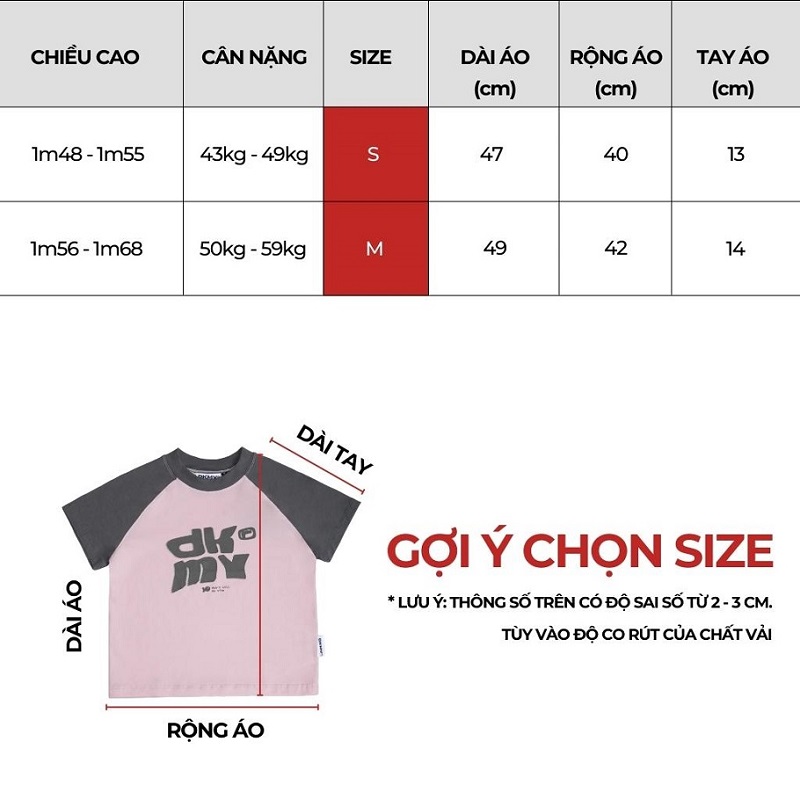 Với 2 size cơ bản S/M Áo Baby Tee tay ngắn Raglan giúp các nàng cảm thấy thoải mái lựa chọn kích thước phù hợp với vóc dáng và phong cách của mình. Tham khảo bảng size bên dưới hoặc bạn có thể liên hệ DKVM trực tiếp tư vấn cho bạn nhé!