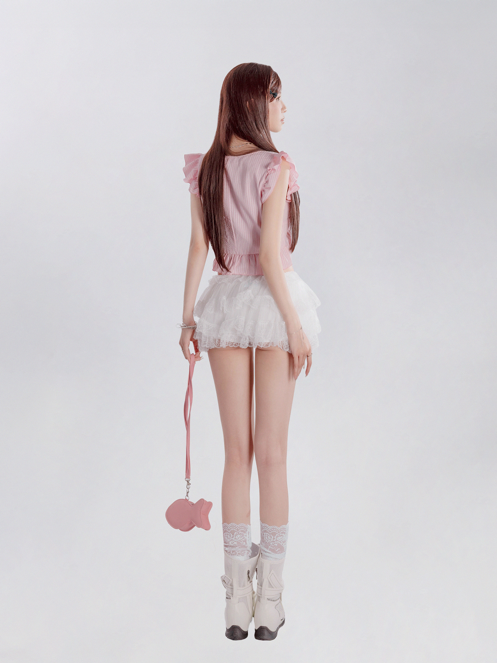 Thiết kế croptop hiện đại kết hợp cùng tay cánh tiên mềm mại, bồng bềnh tạo nên vẻ xinh yêu. Điểm nhấn độc đáo của chiếc áo là chi tiết thắt dây trước ngực, không chỉ làm tăng thêm nét điệu đà mà còn giúp bé dễ dàng điều chỉnh, tạo form áo vừa vặn.