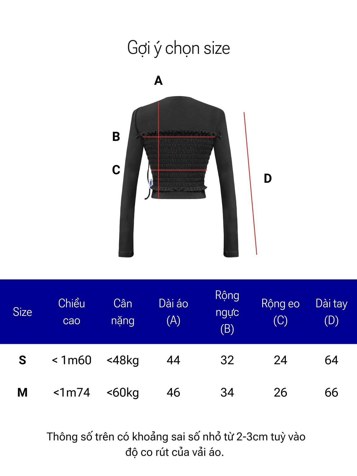 | Size | Rộng ngực | Rộng eo | Dài áo | Dài tay |