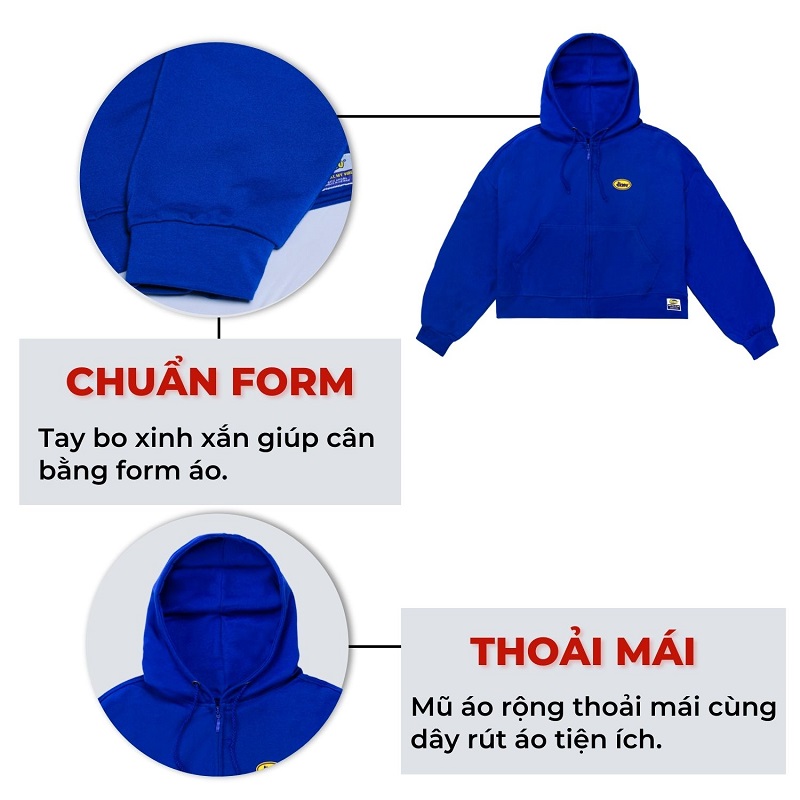 - Form dáng: Áo hoodie zip oversize được cải tiến với thiết kế croptop độc đáo mang lại trải nghiệm mới mẻ cho người mặc.