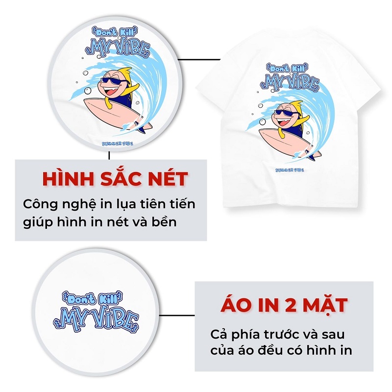 - Áo thun tay lỡ unisex thu hút các tín đồ Tee graphic "ngay từ ánh nhìn đầu tiên" với hình ảnh chú cá Don't Kill My Vibe ngộ nghĩnh được chuyển tiếp khi áp dụng in lụa sắc nét, tối ưu được độ bóng mượt khi lên màu.