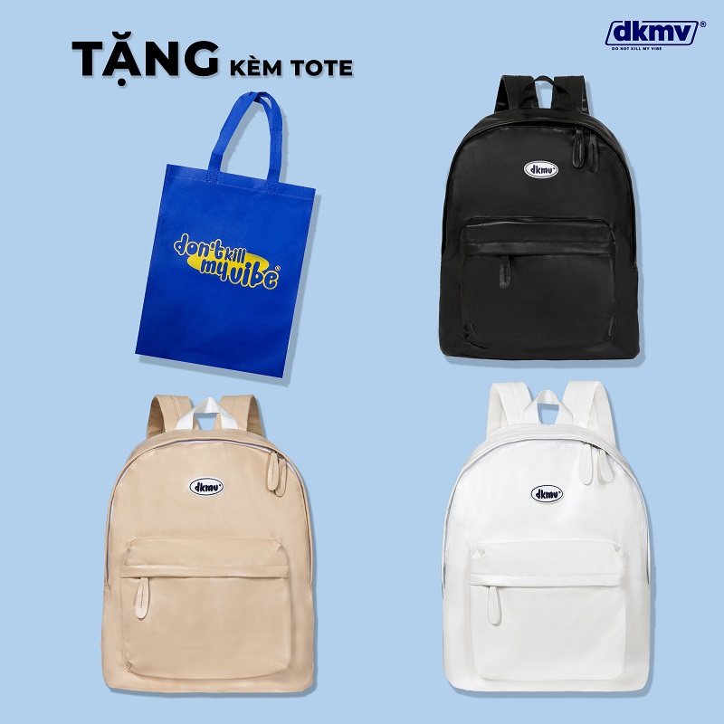 - Chi tiết tag Logo su thương hiệu DKMV nổi bật phía trước balo da nữ đi học màu kem.