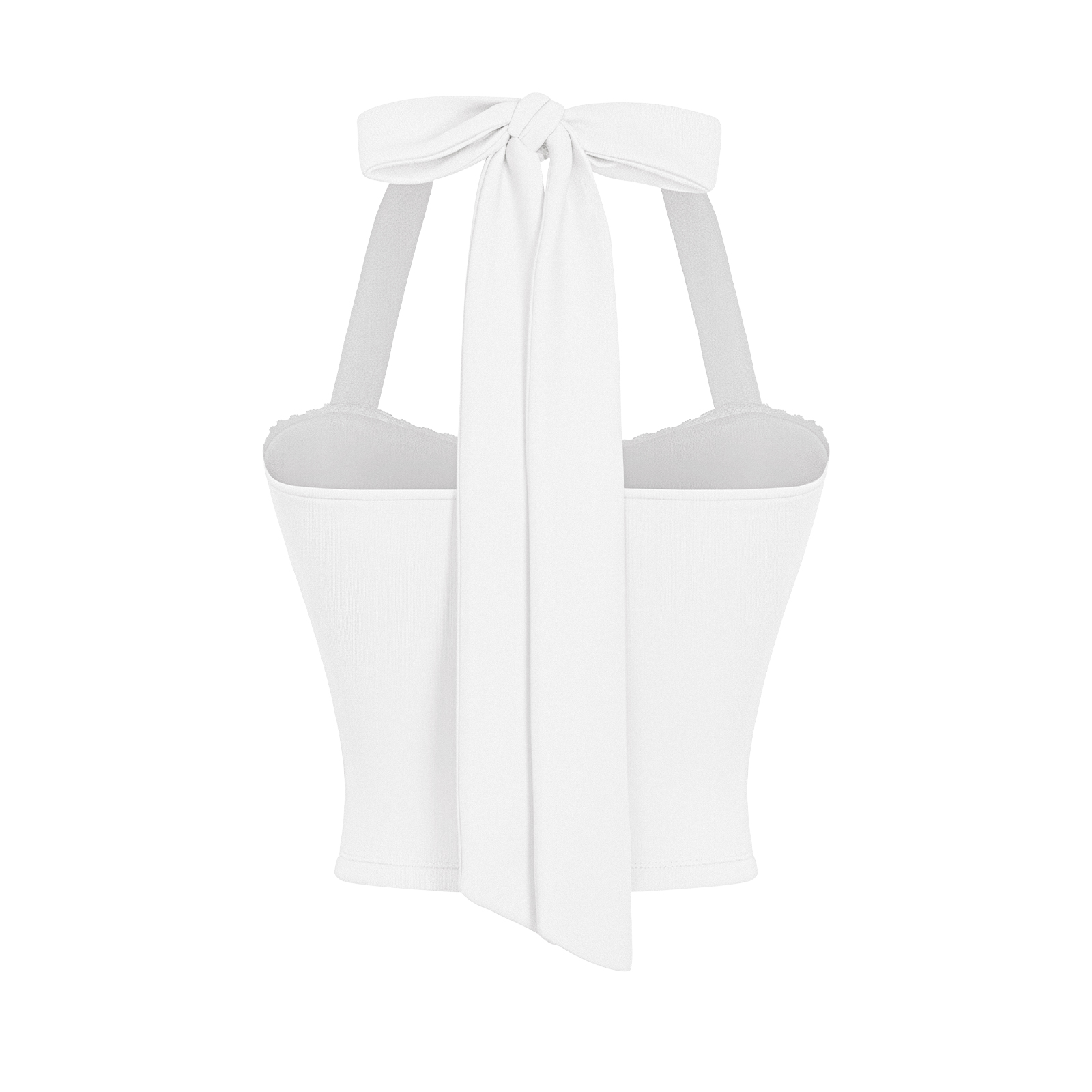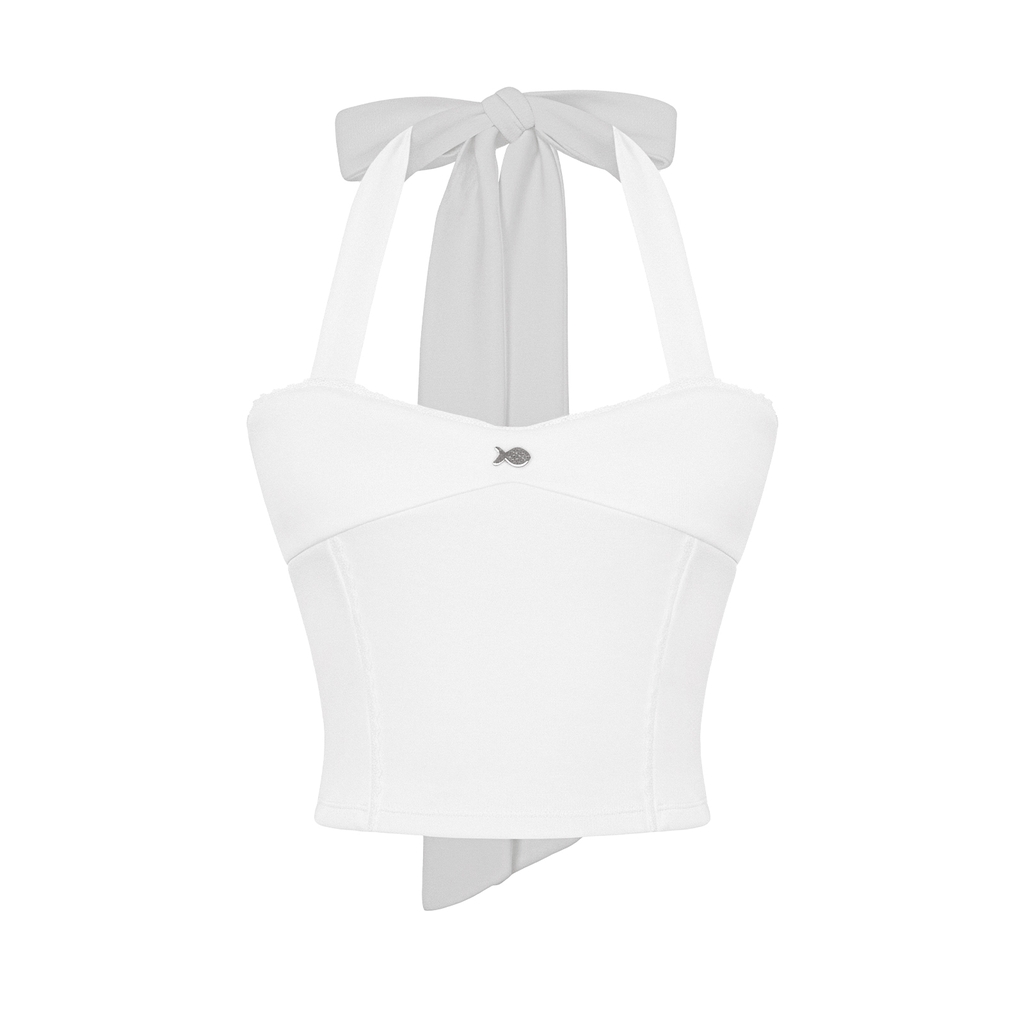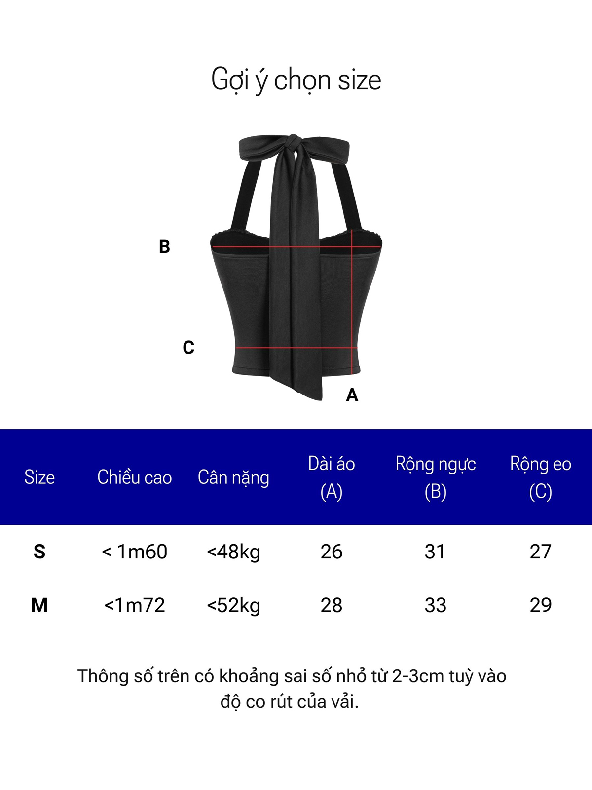 Đây là một thiết kế croptop hiện đại với kiểu dáng cổ yếm thanh thoát kết hợp cúp ngực duyên dáng, giúp tôn lên bờ vai mềm mại và xương quai xanh của bé. Sự điệu đà được thể hiện qua chi tiết phối viền ren mảnh mai chạy dọc thân áo, tạo nên họa tiết mềm mại và nữ tính.