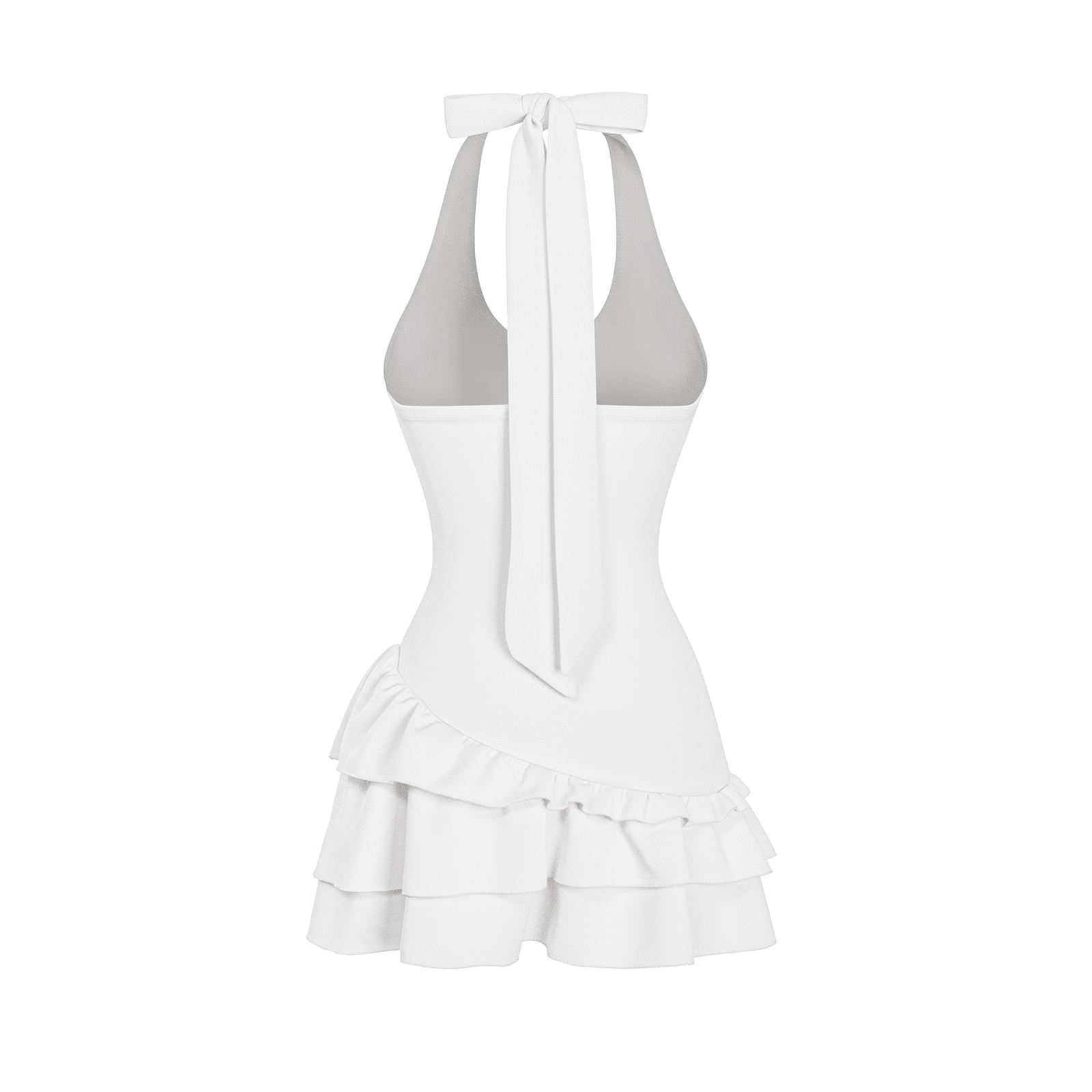 Dáng váy xòe xếp tầng bồng bềnh như một đóa hoa, kết hợp với chi tiết tà váy lệch độc đáo, tạo nên sự chuyển động thướt tha đầy cuốn hút và phong thái tiểu thư.