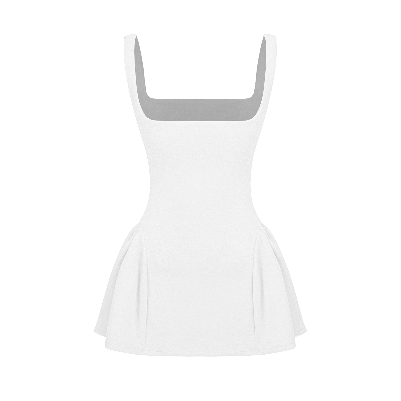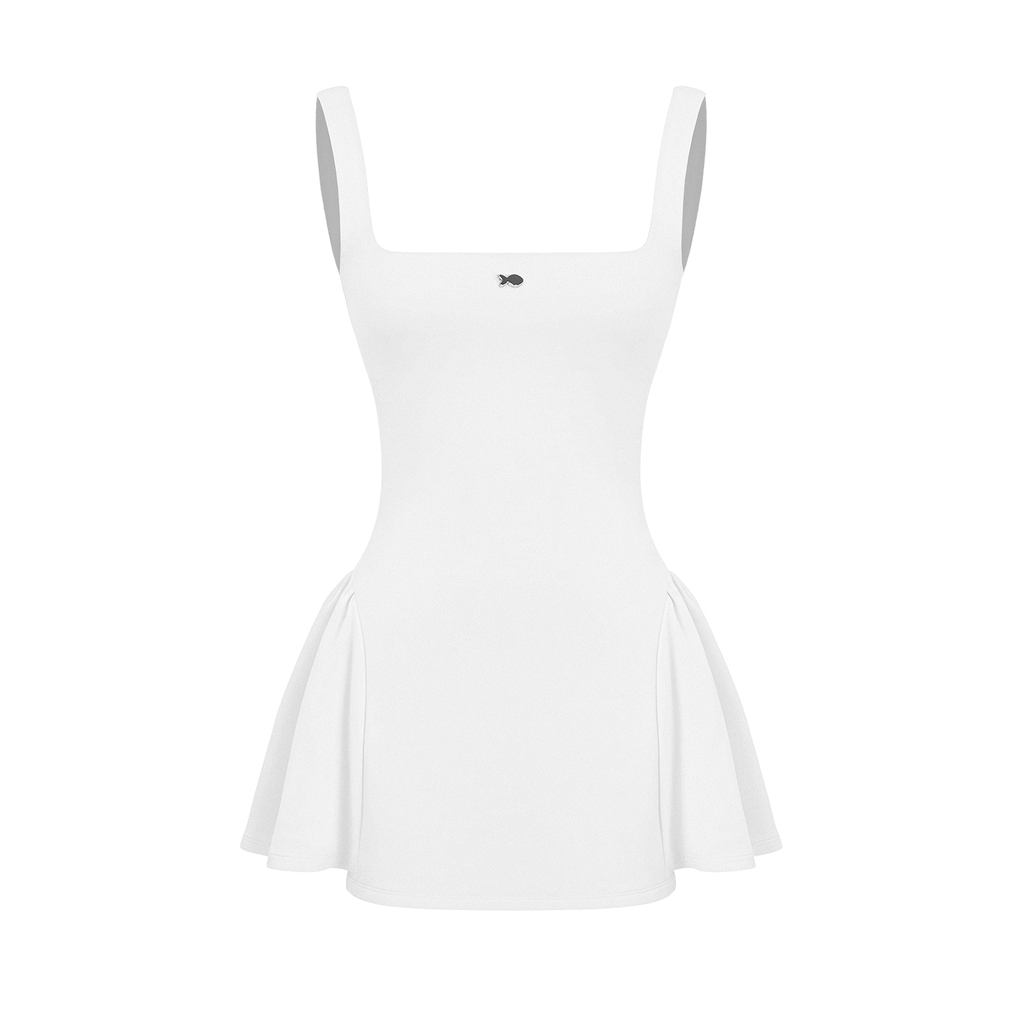 Đầm được may từ thun 2 da co giãn nhẹ, ôm trọn thân trên xinh xắn rồi chuyển xuống form xòe bồng nhẹ nhàng, tạo độ phồng đáng yêu. Chi tiết đính logo cá nhỏ nhắn được đặt khéo léo, mang lại một chút lấp lánh tinh nghịch và điệu đà cho chiếc đầm trắng.