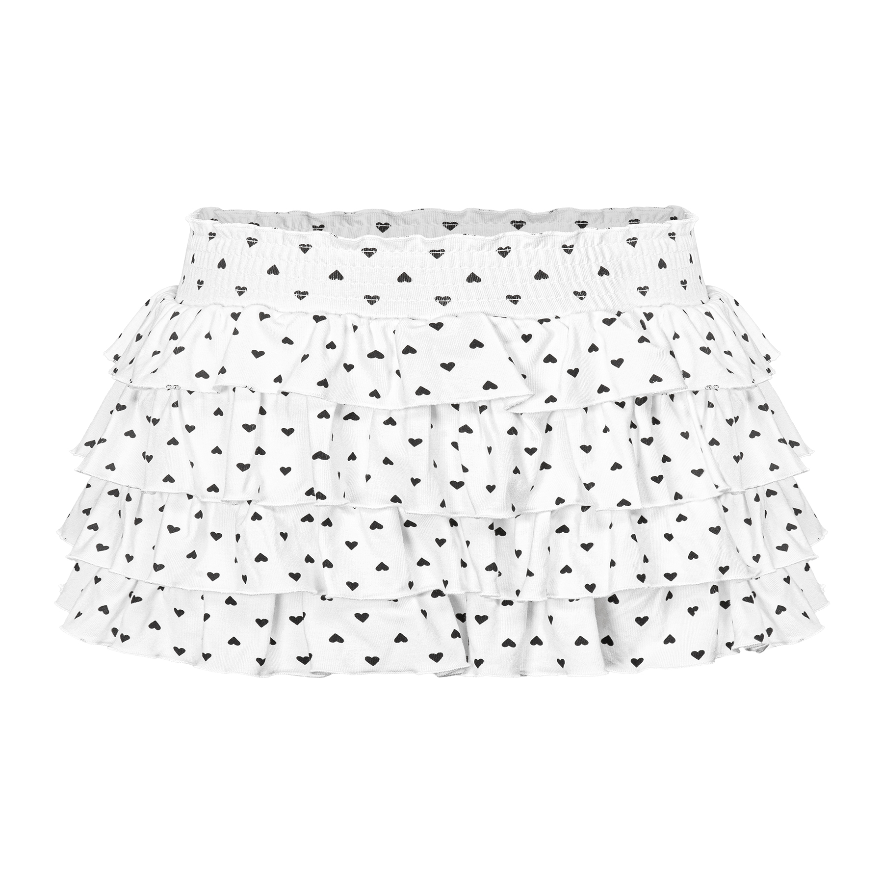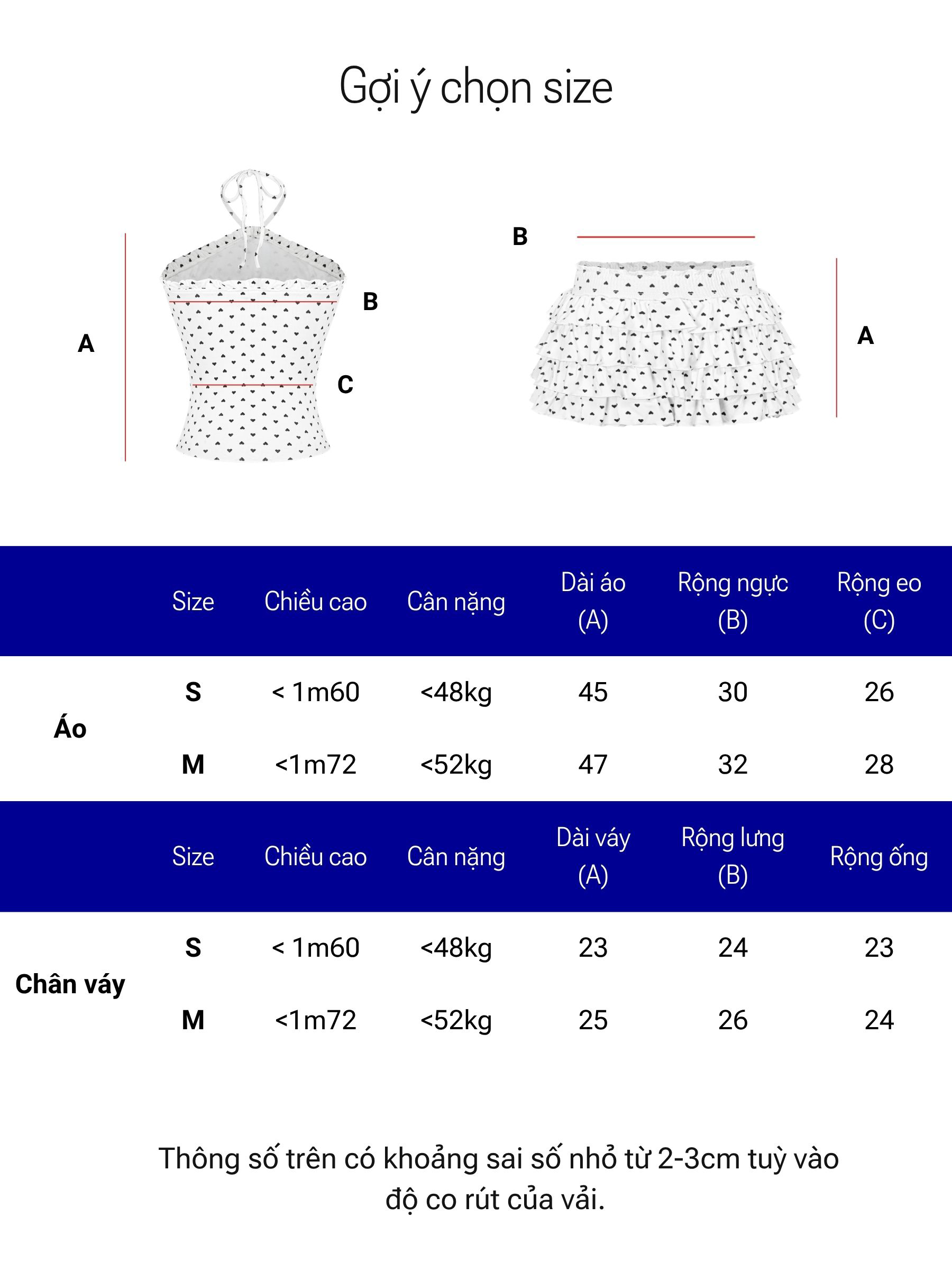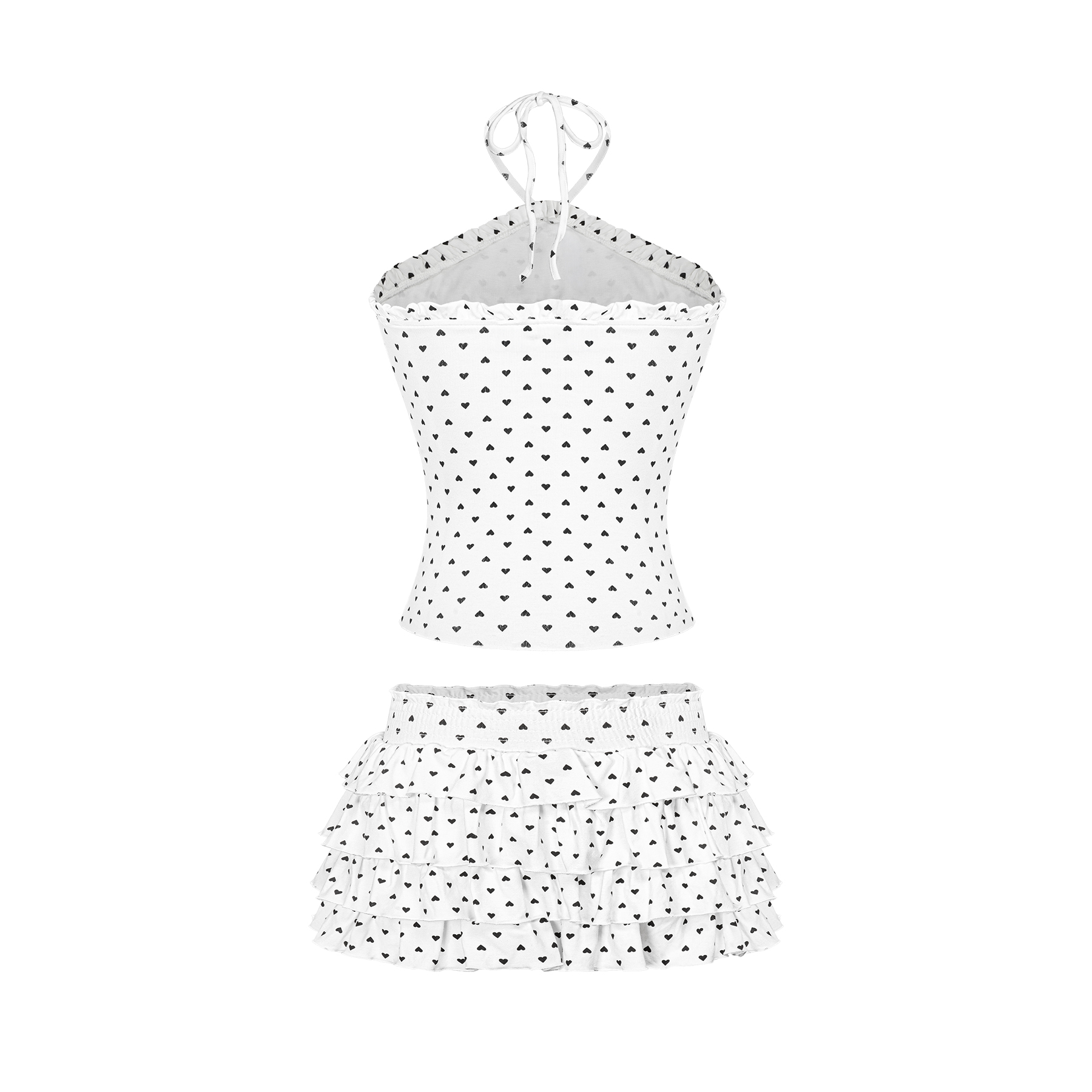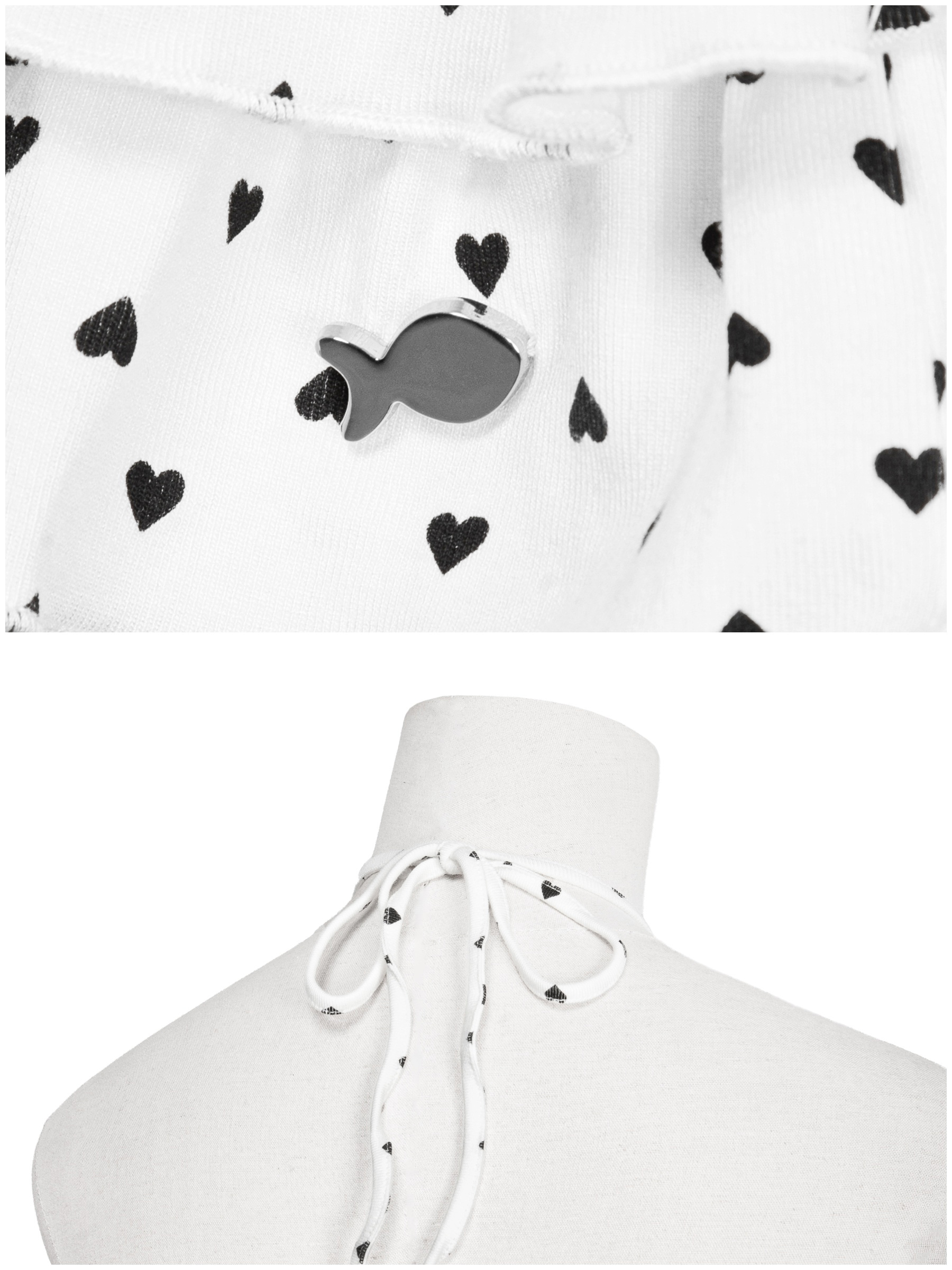 Với họa tiết chấm bi trái tim đen nổi bật trên nền vải trắng tinh khôi, set đồ mang đến một diện mạo cực kỳ xinh yêu, vừa mang chút hơi thở retro lại vừa vô cùng hiện đại.