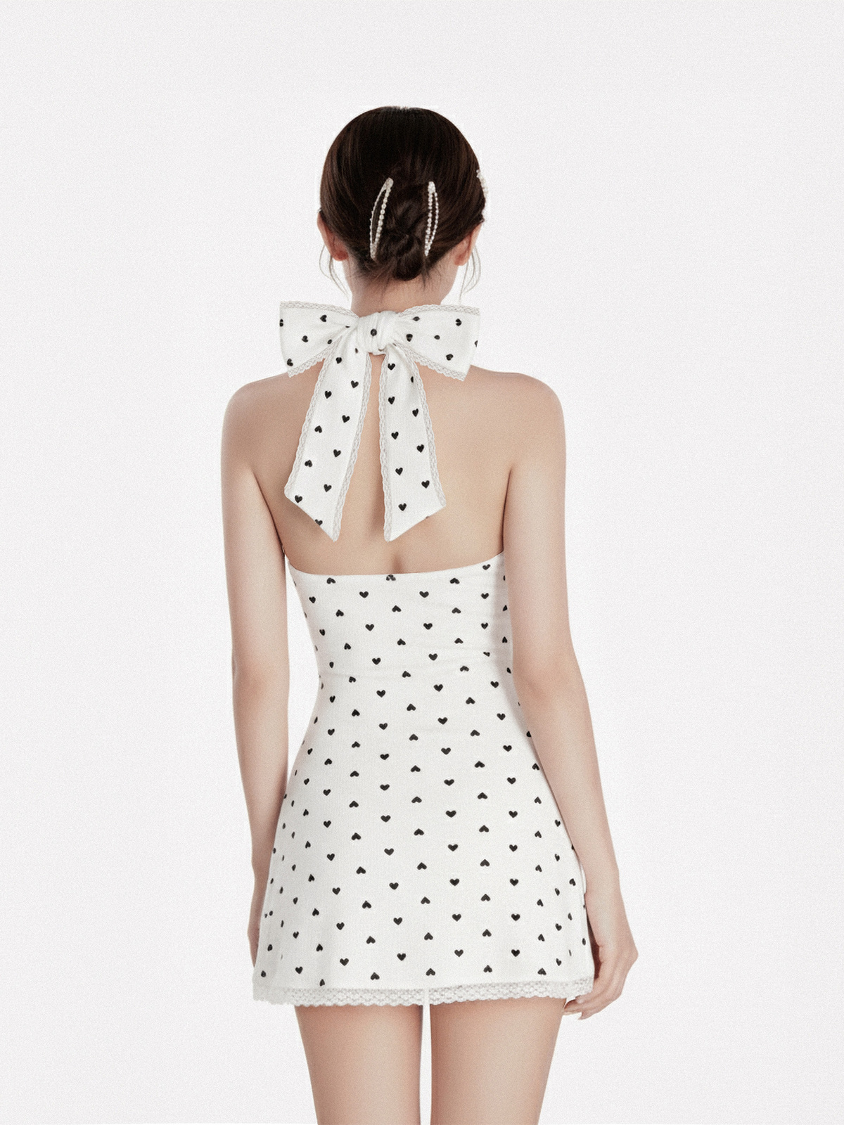 Điểm nhấn đầu tiên nằm ở kiểu cổ yếm thắt nơ tinh tế, tạo nên sự duyên dáng tuyệt đối. Hoạ tiết trái tim xinh xắn phủ khắp thân đầm dệt nên một bầu không khí ngọt ngào, mộng mơ. Chiếc đầm còn táo bạo khoe một chút lưng trần mềm mại kết hợp viền ren mỏng.