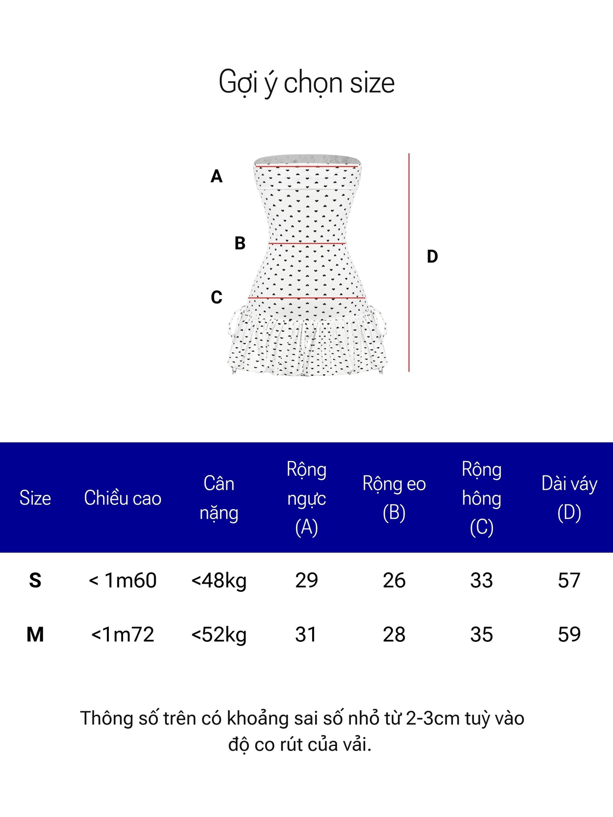 | Size | Rộng ngực | Rộng eo | Rộng hông | Dài váy |