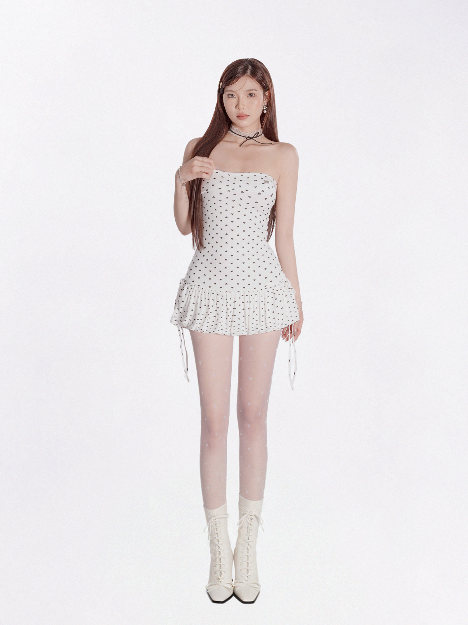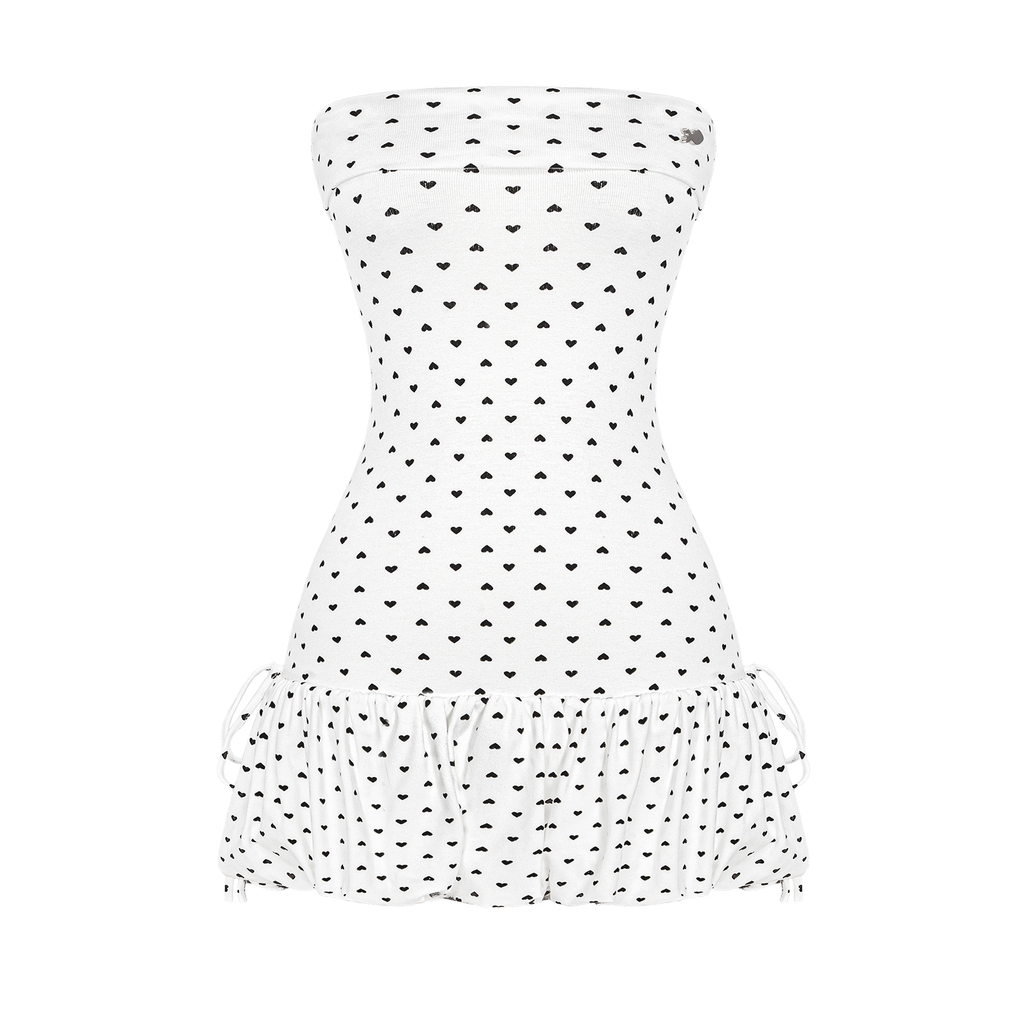 Điểm nhấn làm nên sự duyên dáng của chiếc đầm chính là hoạ tiết chấm bi hình trái tim nhỏ xinh, lan tỏa sự ngọt ngào và nữ tính tuyệt đối. Thiết kế cúp ngực gợi mở nét e ấp cho bờ vai thanh thoát của bé.