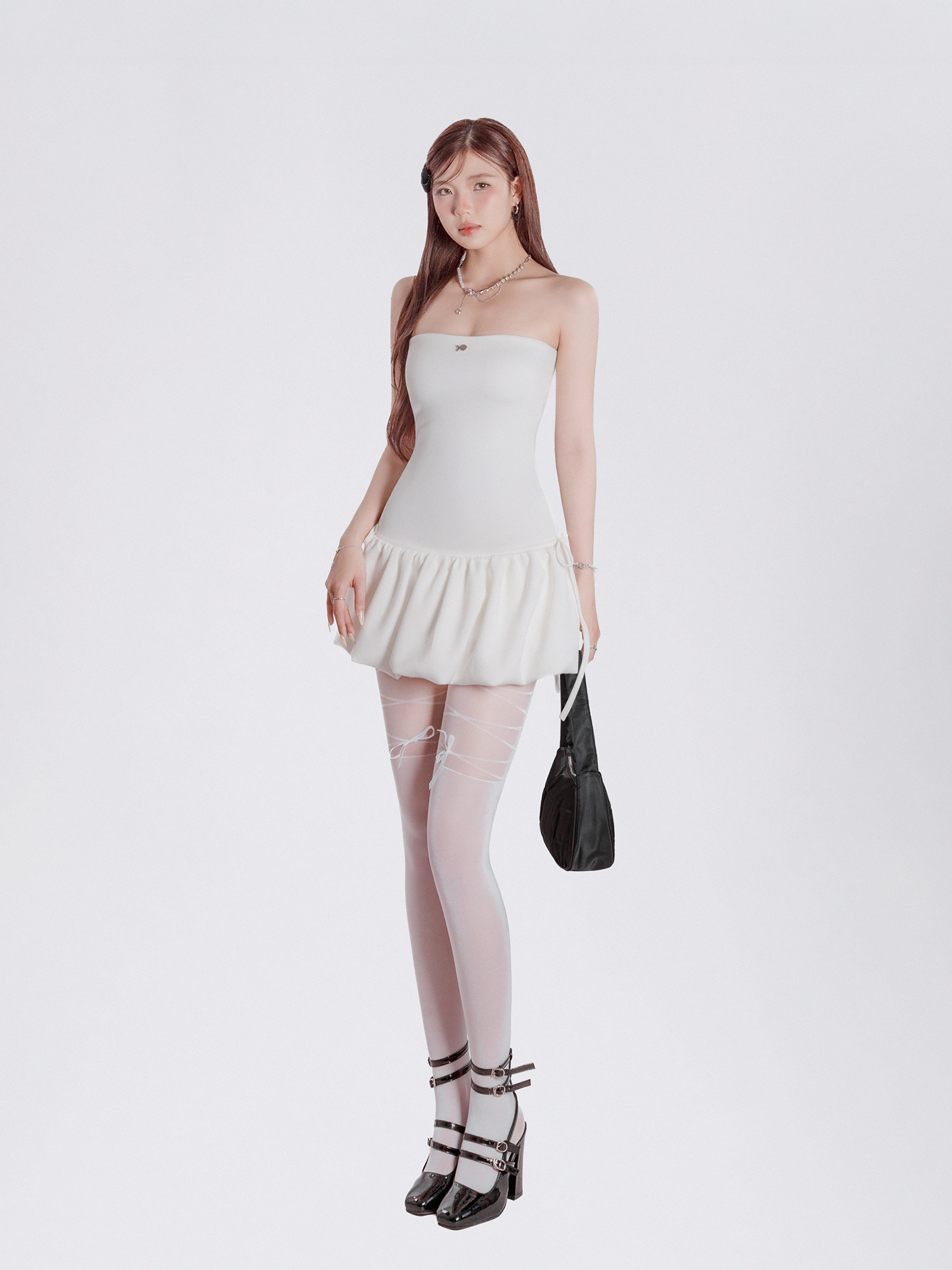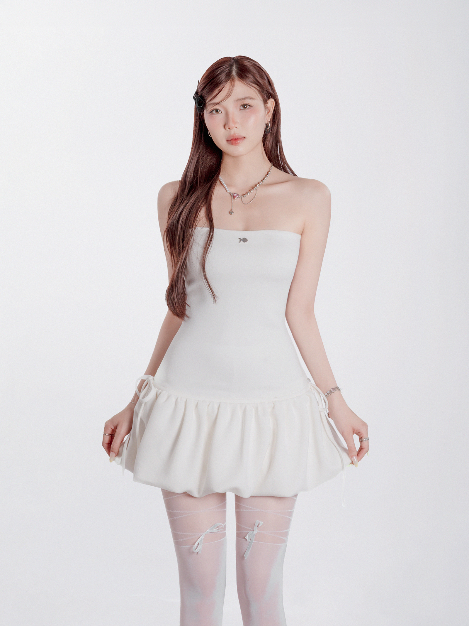 Areum Dress là chiếc đầm cúp ngực dáng ngắn xòe bồng, mang lại cảm giác vừa dịu dàng vừa đáng yêu. Phom váy ôm nhẹ phần thân trên, xòe nhẹ từ eo, tạo độ bồng bềnh tự nhiên trong từng chuyển động.