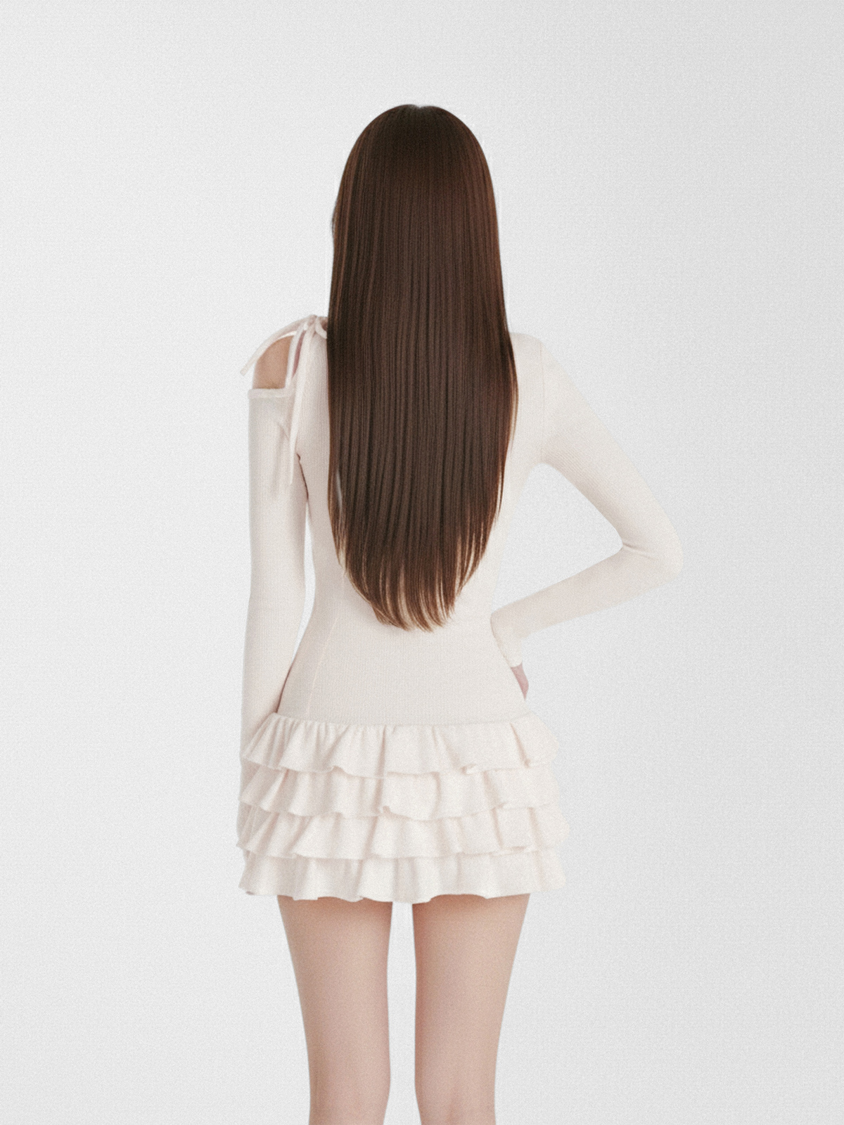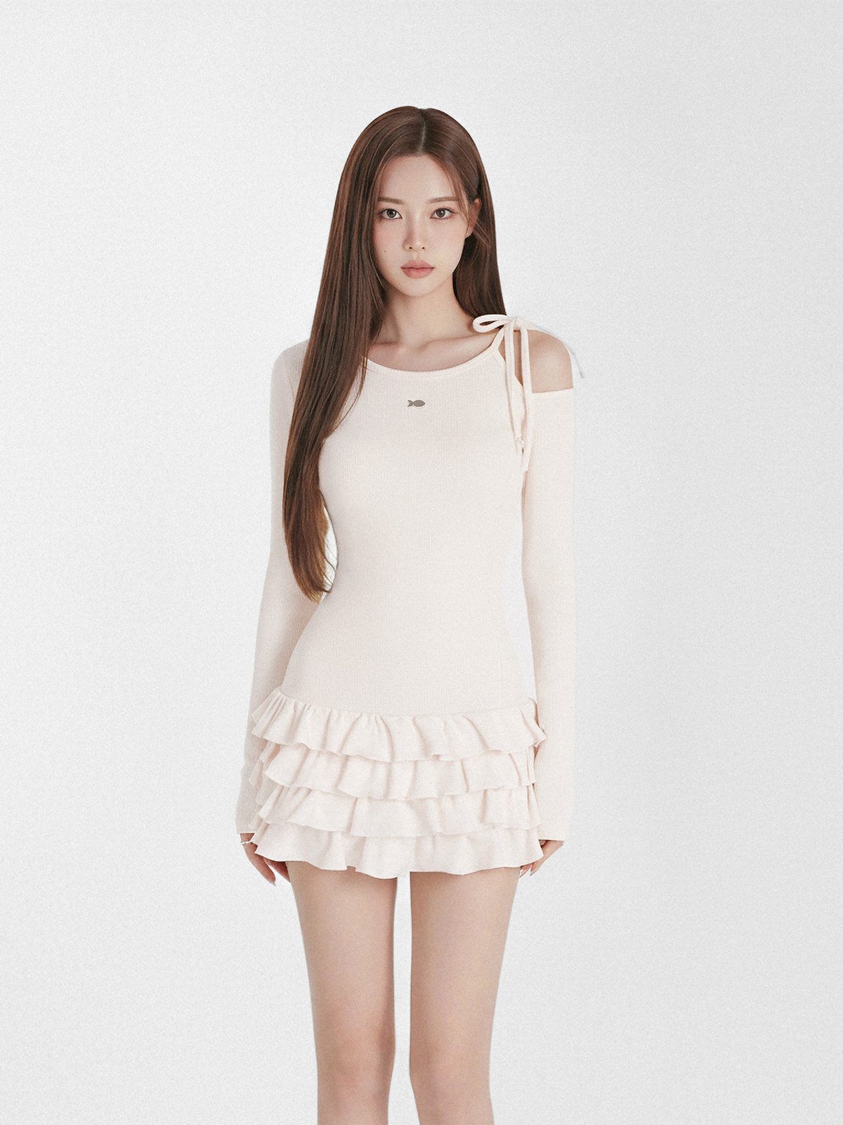 Thiết kế khoét vai lệch kết hợp cùng chiếc dây nơ thắt nhỏ xinh tạo nên một điểm nhấn cực kỳ điệu đà. Phần tay dài thanh thoát phối cùng dáng váy xòe xếp tầng bồng bềnh giúp bé trông như một nàng công chúa bước ra từ truyện cổ tích.