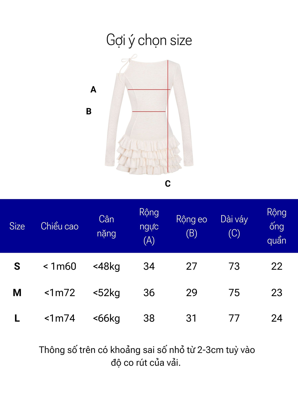 | Size | Rộng ngực | Rộng eo | Nối hông | Dài váy |