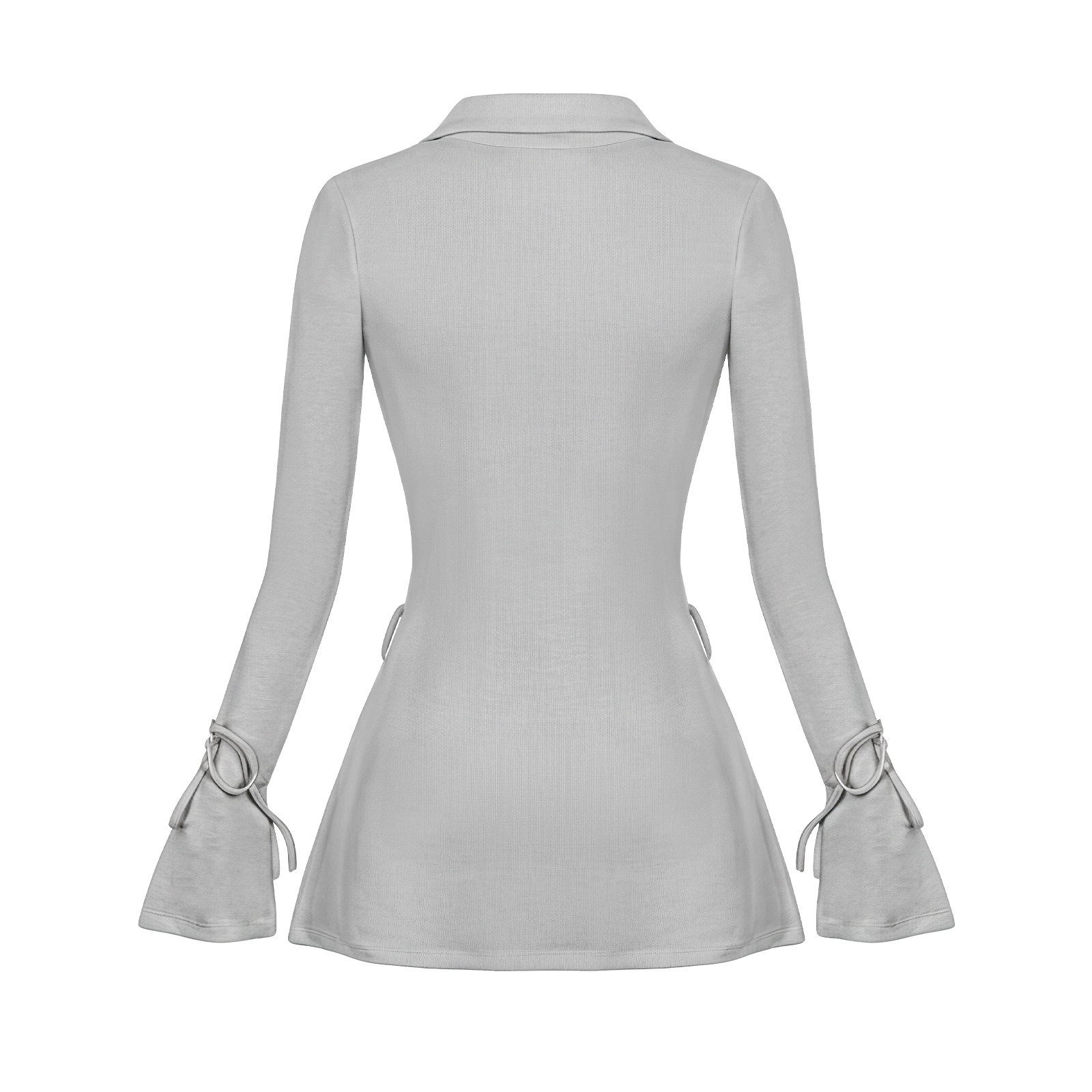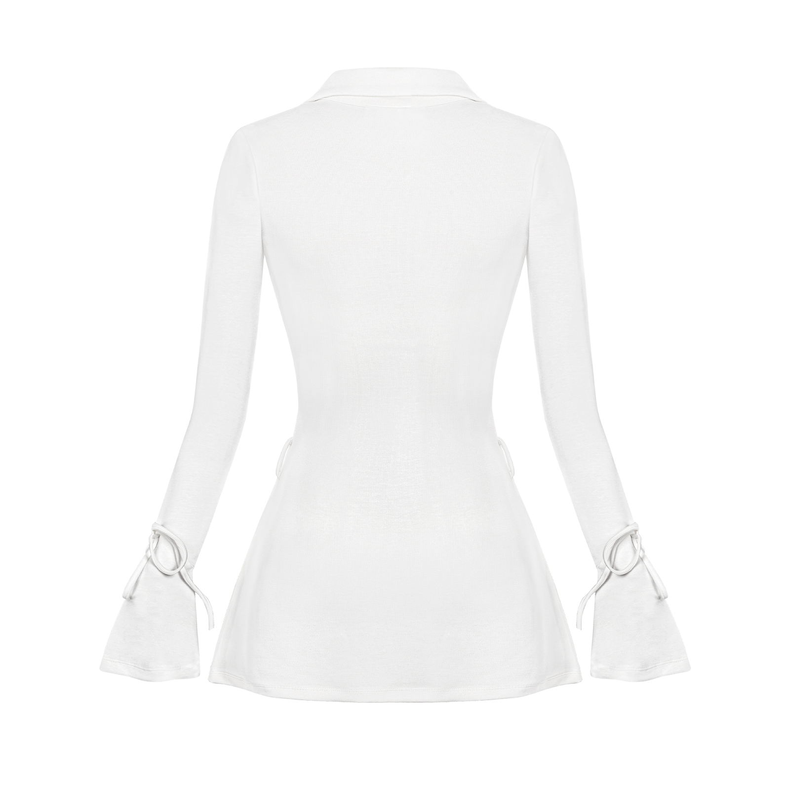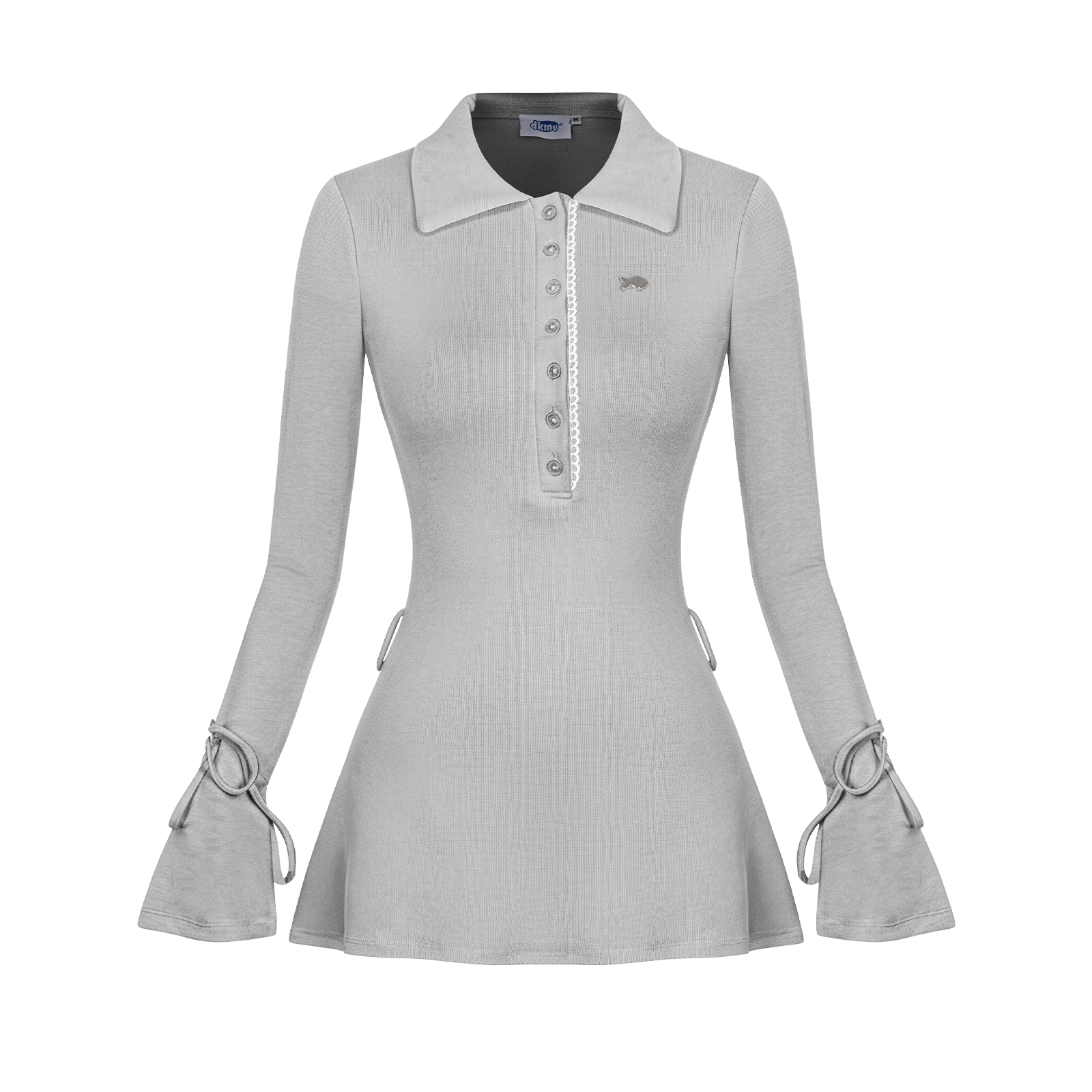Jina Dress gây ấn tượng với kiểu dáng cổ polo cổ điển, kết hợp chi tiết cài nút duyên dáng được tô điểm bằng viền ren mỏng. Sự khác biệt nằm ở phần tay áo loe mềm mại, thắt dây nơ điệu nghệ, mang đến nét nữ tính, e ấp đầy cuốn hút.
