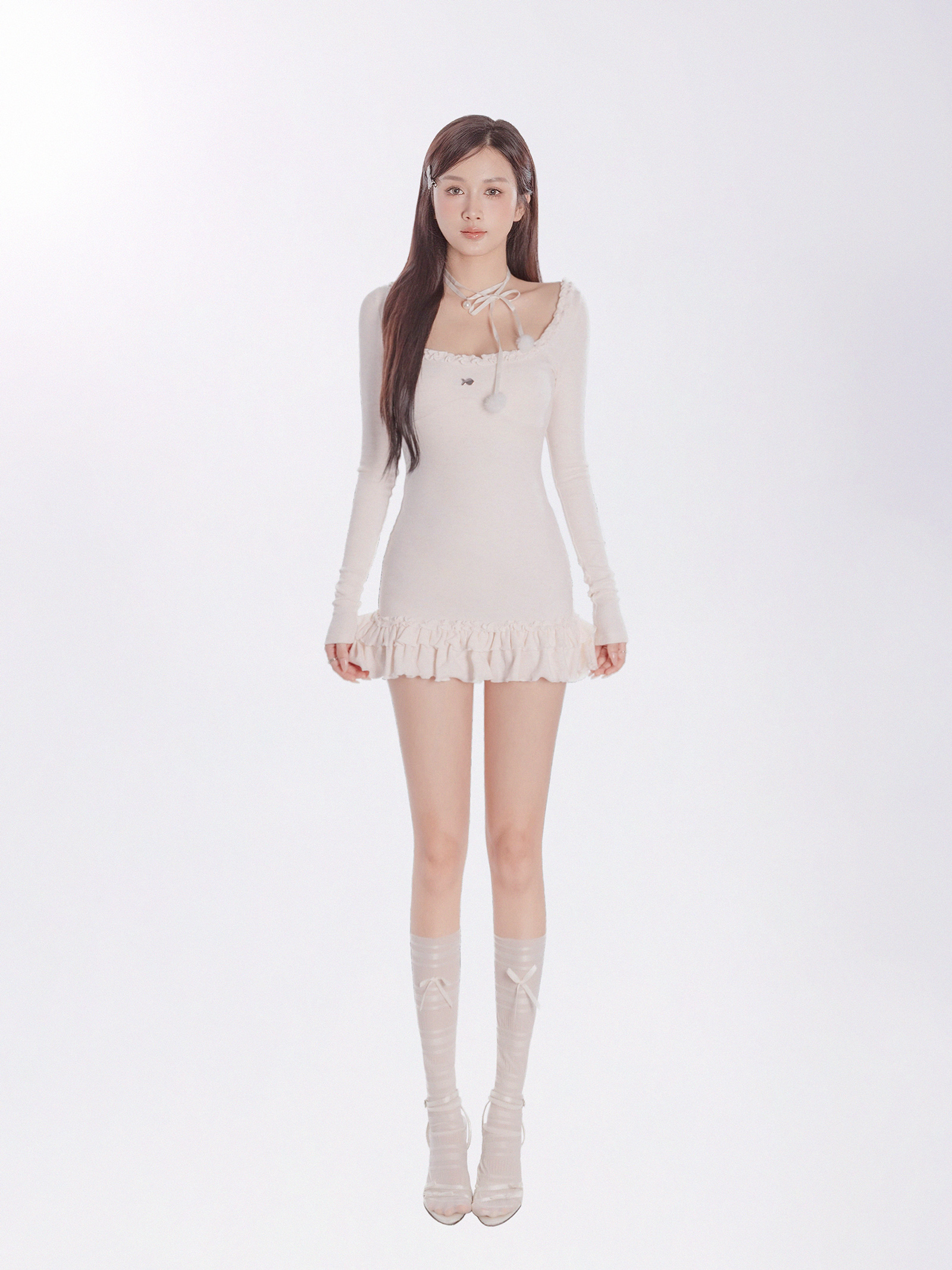Đầm nổi bật với tay dài kín đáo nhưng vẫn tạo cảm giác nhẹ nhàng nhờ chi tiết phối bèo nhún tinh tế, mang lại sự điệu đà và nữ tính cho phần vai. Dáng đầm đuôi cá ngắn đáng yêu ôm nhẹ nhàng, chuyển dần thành phần lai xòe nhẹ, tôn lên vóc dáng duyên dáng của bé.
