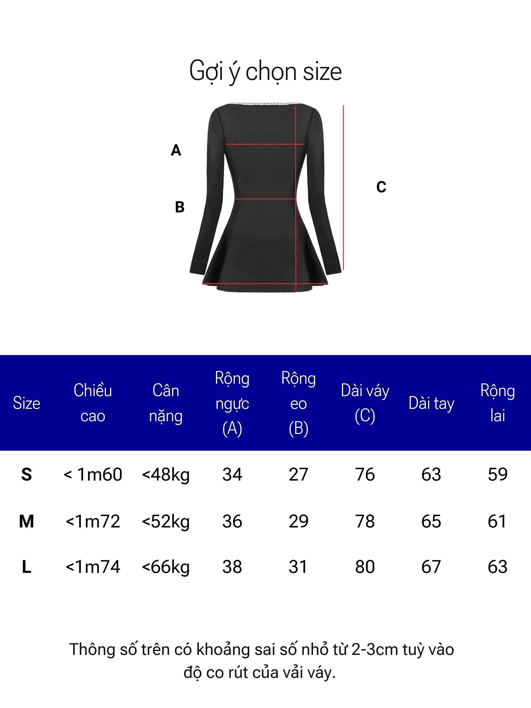 | Size | Rộng ngực | Rộng eo | Dài váy | Dài tay |