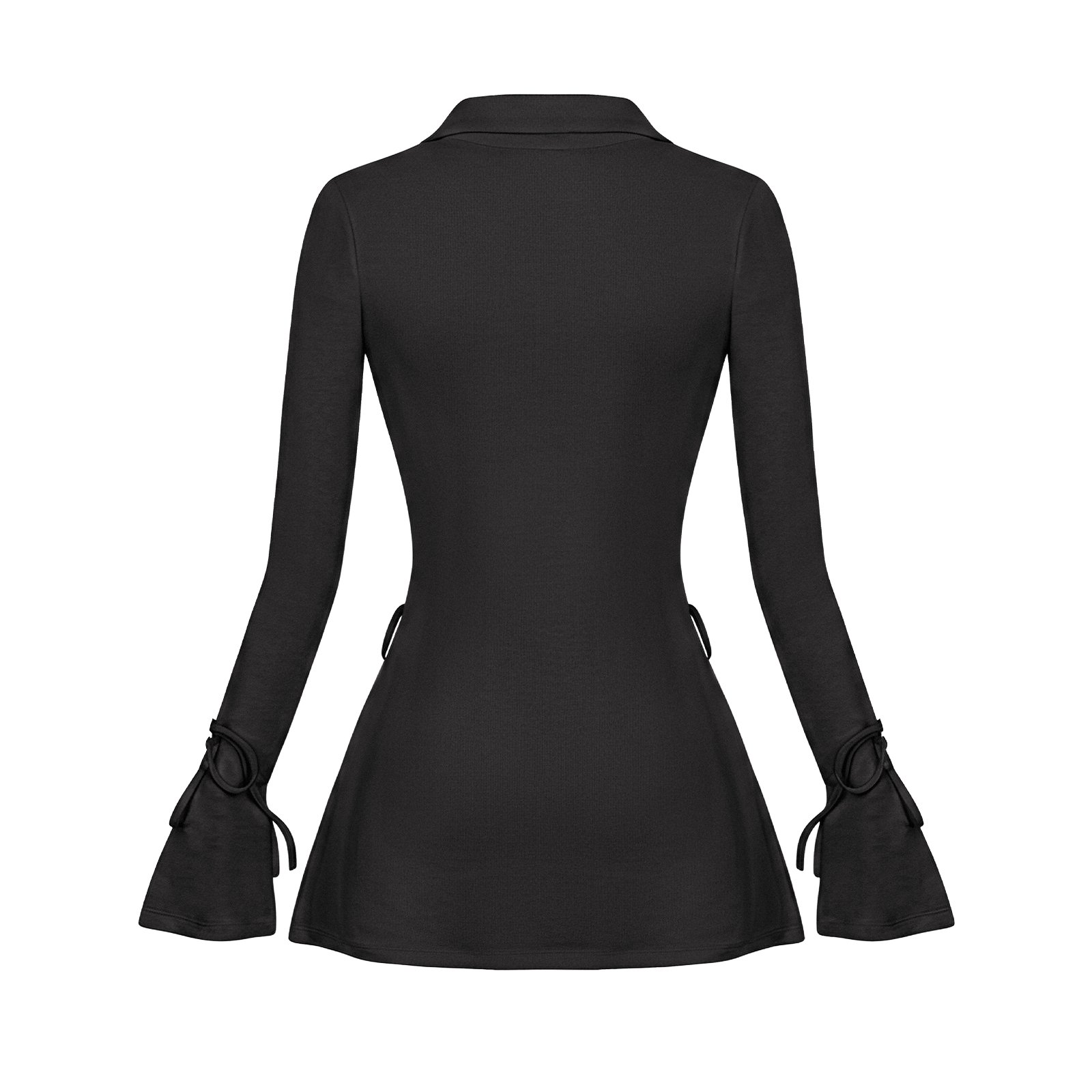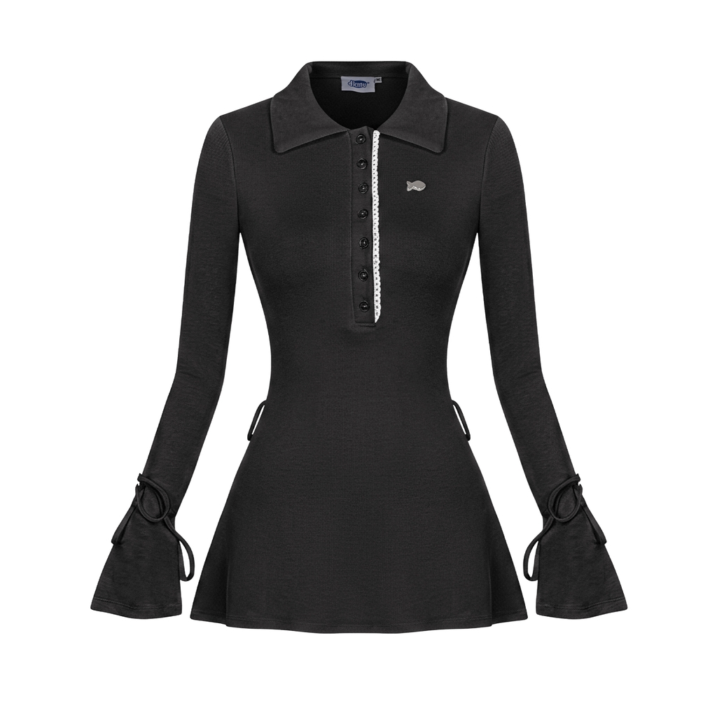 Hàng cúc phía trước được đính dây ren tinh tế, mang lại cảm giác e ấp và hoài cổ. Phần tay áo loe nhẹ nhàng, điểm xuyết thêm những chiếc nơ nhỏ xinh thắt điệu đà.