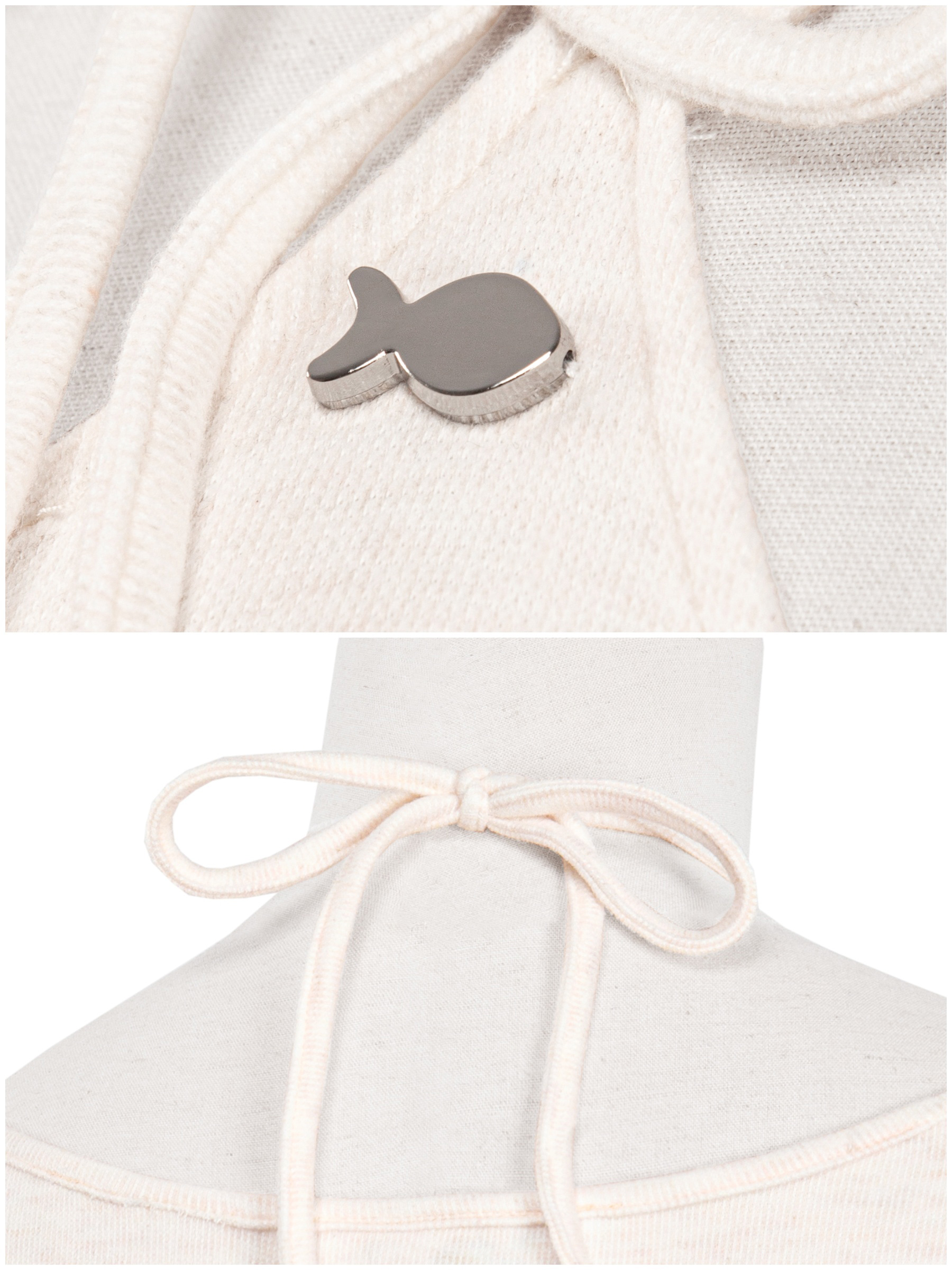 Chiếc logo cá inox lấp lánh đính trên nền vải kem như một điểm xuyết sang xịn, khẳng định phong cách đáng yêu đặc trưng của nhà DKMV.