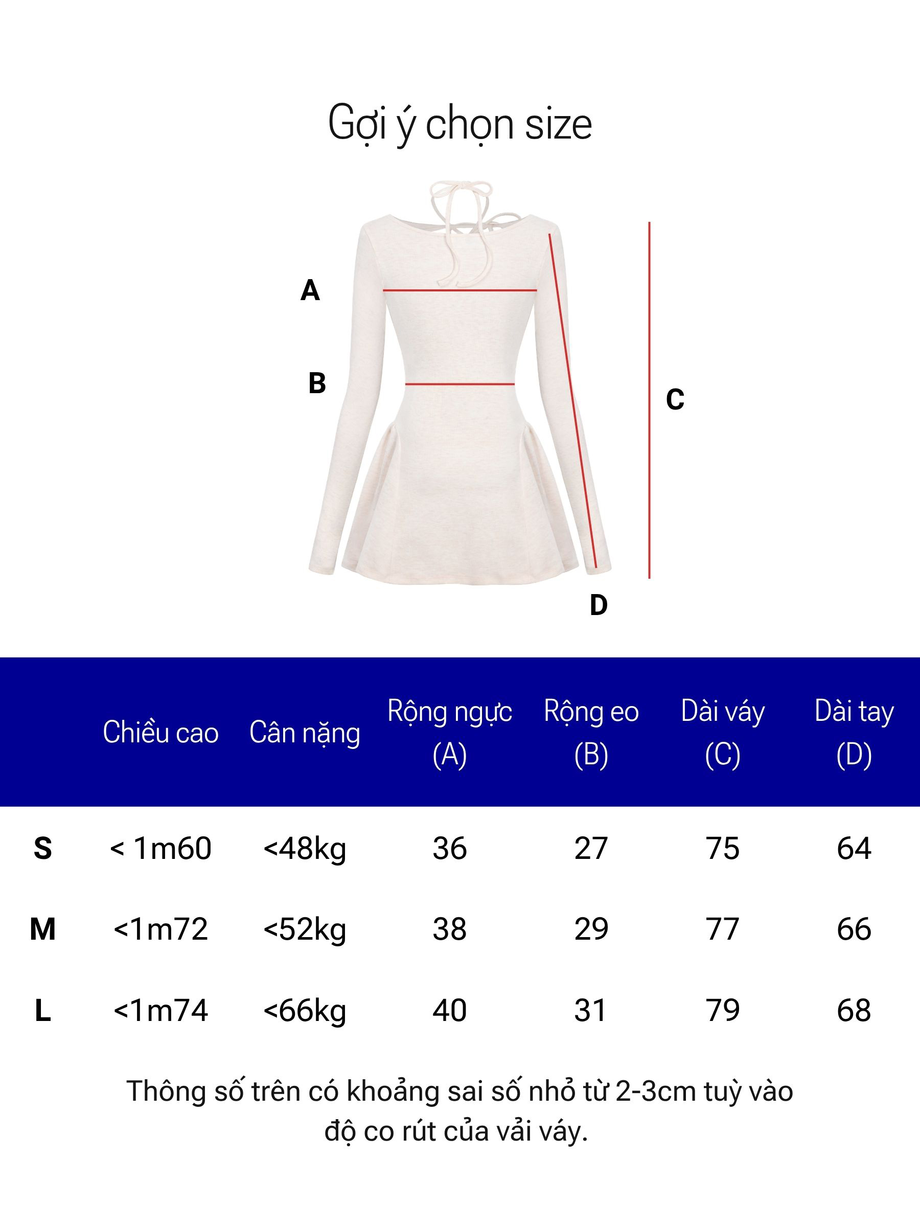 | Size | Rộng ngực | Rộng eo | Dài váy | Rộng bắp tay |