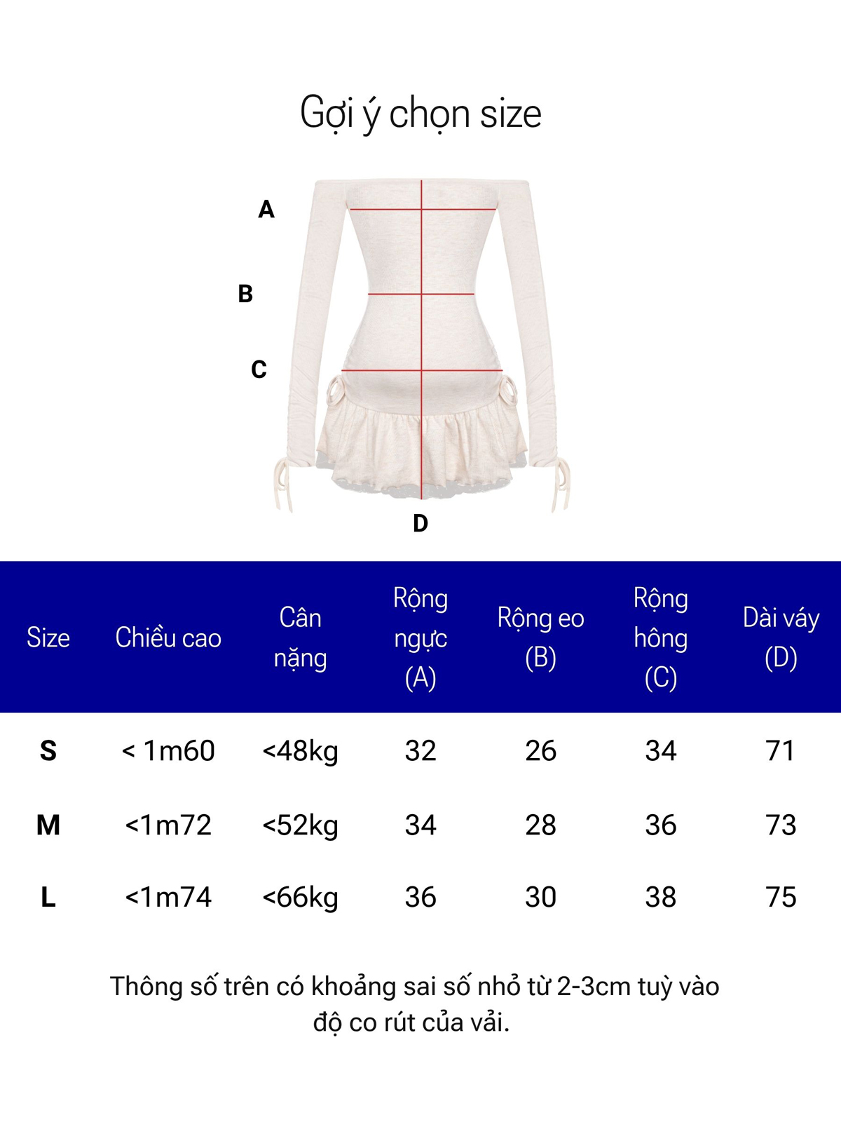 | Size | Rộng ngực | Rộng eo | Nối hông | Dài váy |