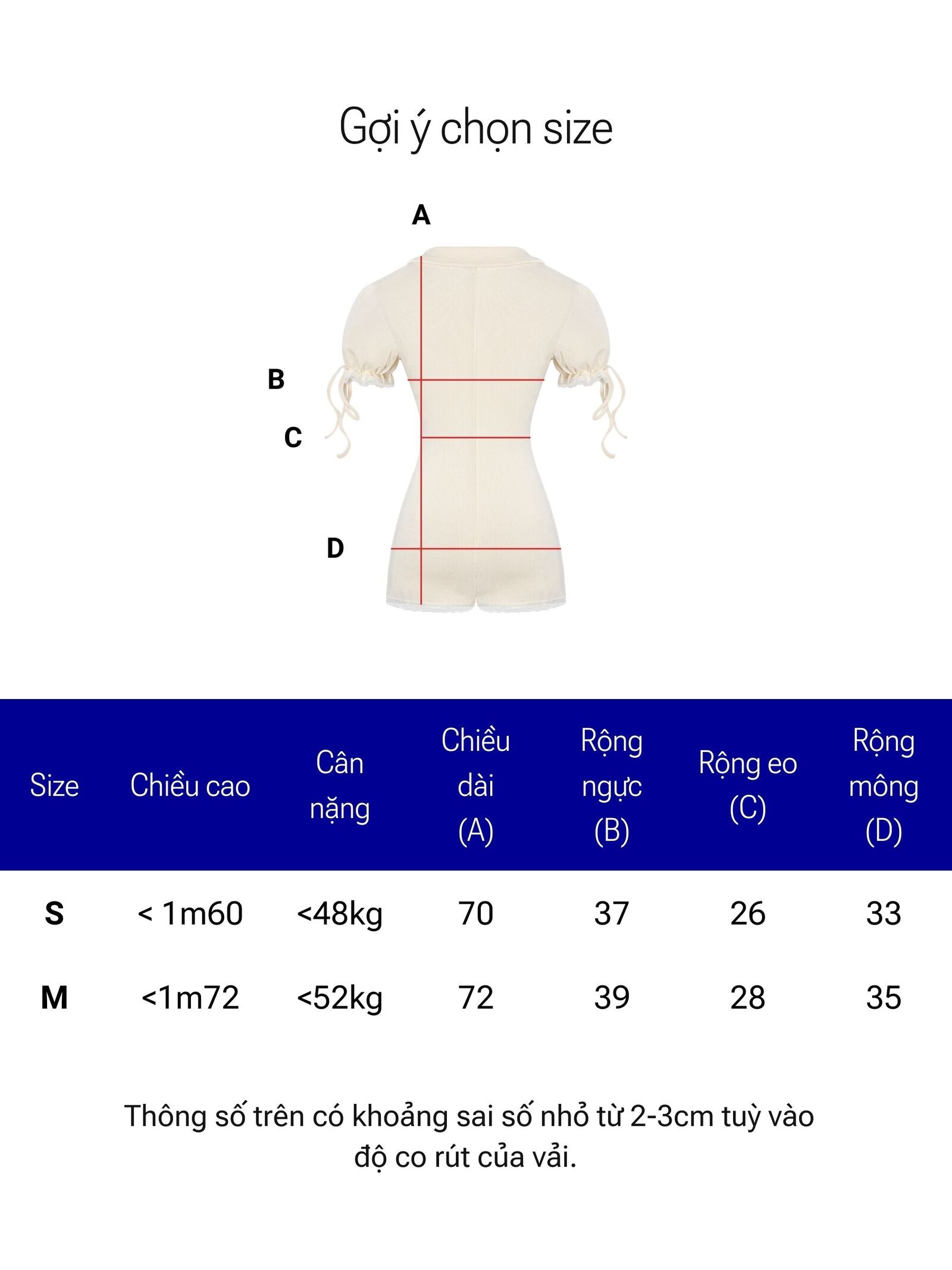 | Size | Rộng ngực | Rộng eo | Rộng mông | Chiều dài |