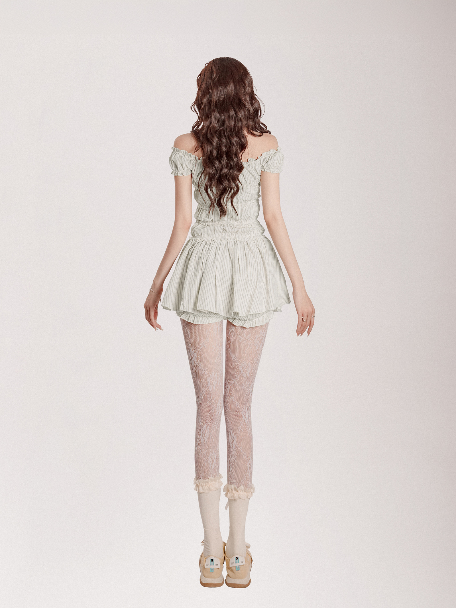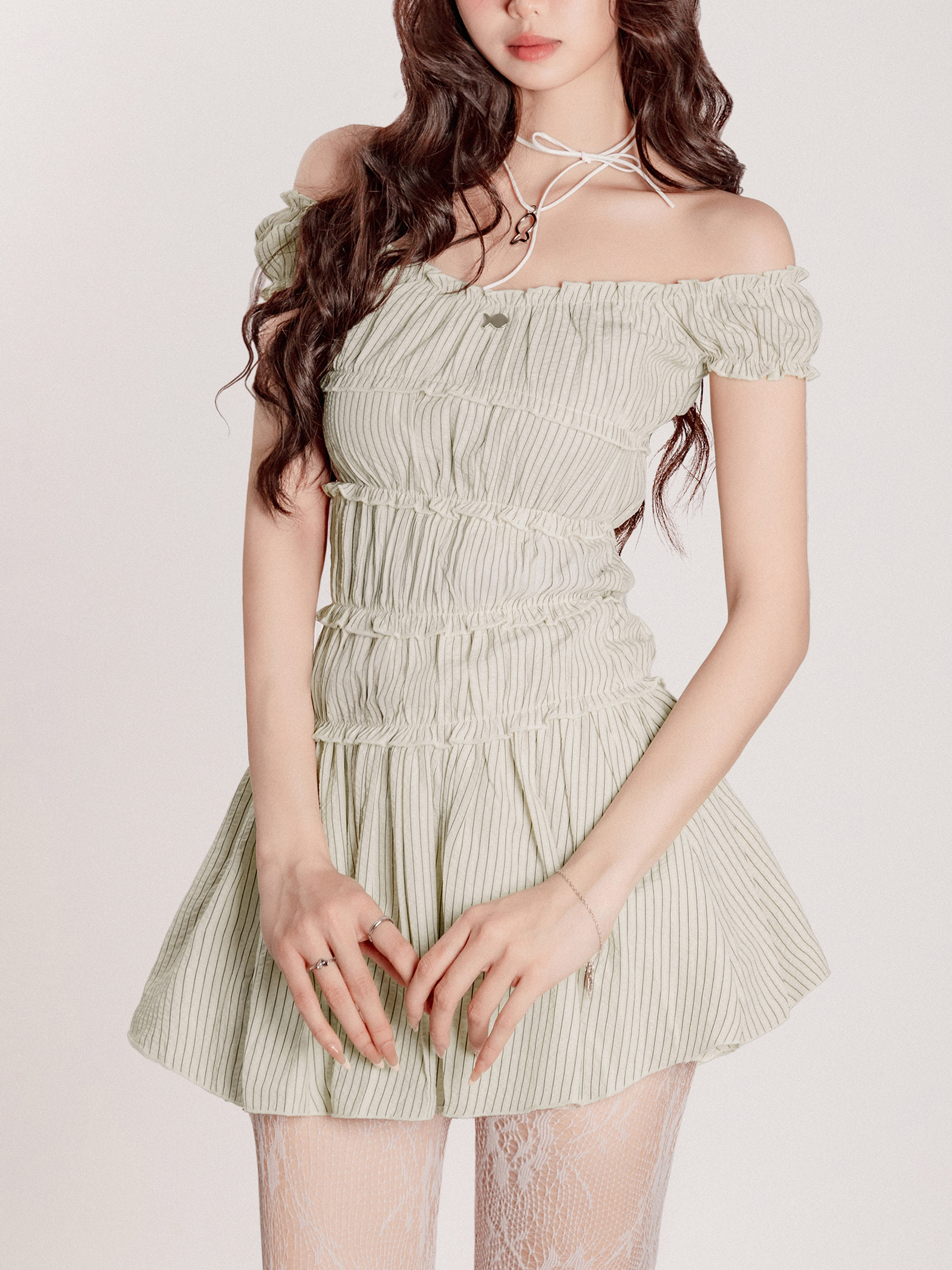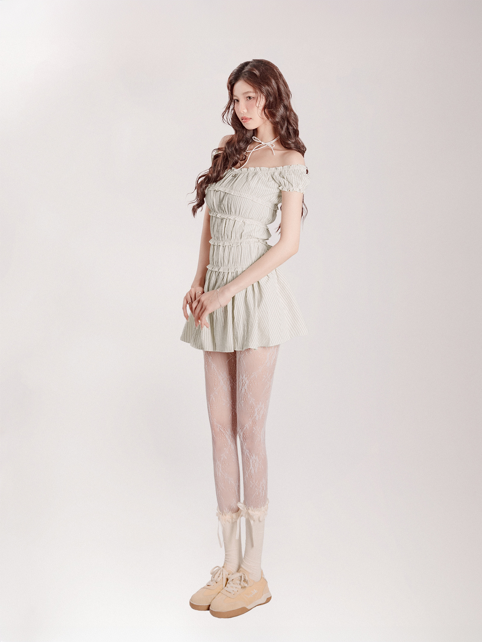 Chiếc váy trễ vai thu hút ánh nhìn với thiết kế tay bồng nhẹ nhàng, phần vai trễ khẽ buông hờ tạo cảm giác mong manh, duyên dáng. Phom chữ A ngắn thoải mái, tôn dáng nhưng vẫn giữ trọn sự dễ thương tinh tế.