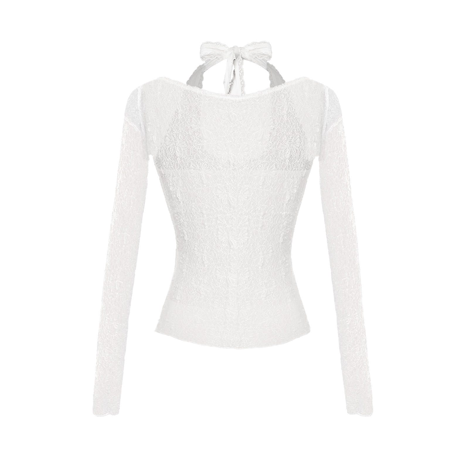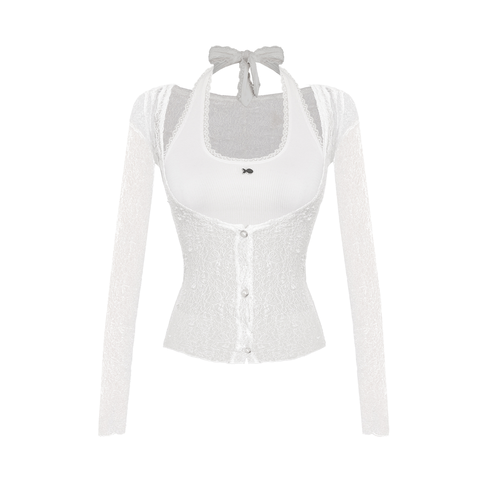 Áo cổ yếm bên trong, được thiết kế thắt dây nơ điệu đà và khoác ngoài là chiếc áo ren dài tay mềm mại, nhẹ nhàng ôm lấy vóc dáng của bé. Điểm nhấn làm nên sự tinh tế chính là những chiếc cúc ngọc trai được đính kết tỉ mỉ, thêm sự sang trọng, lãng mạn cho trang phục.