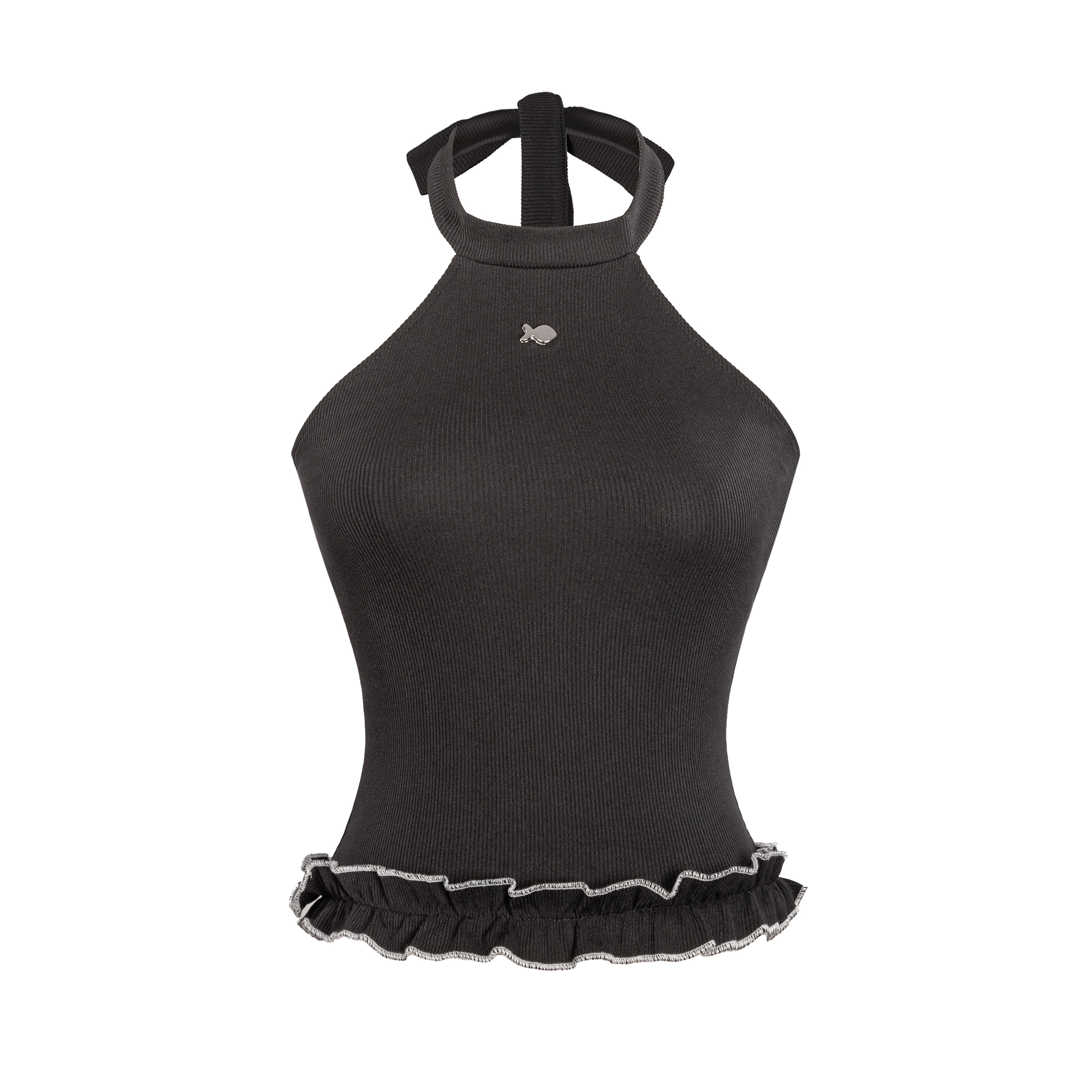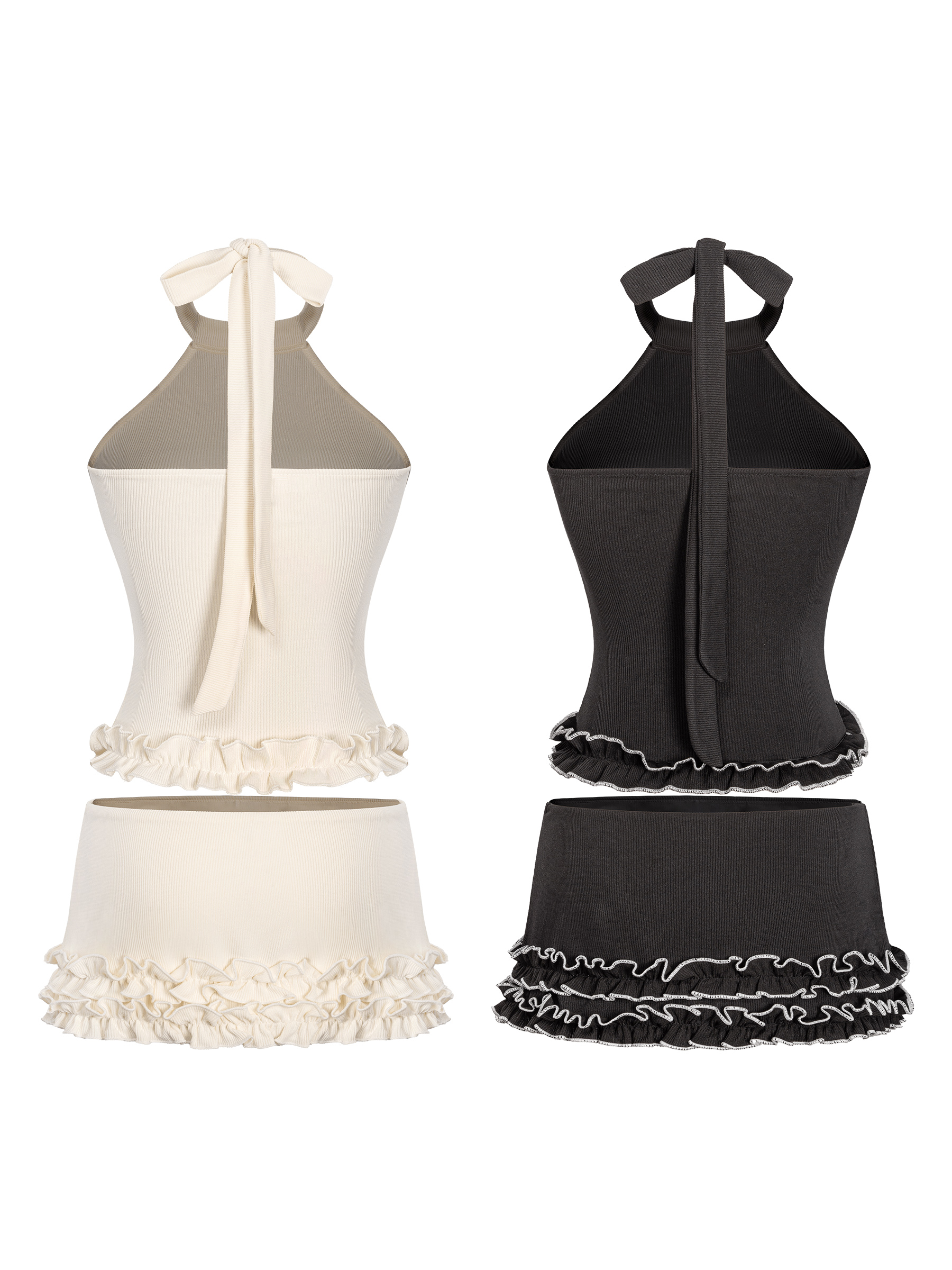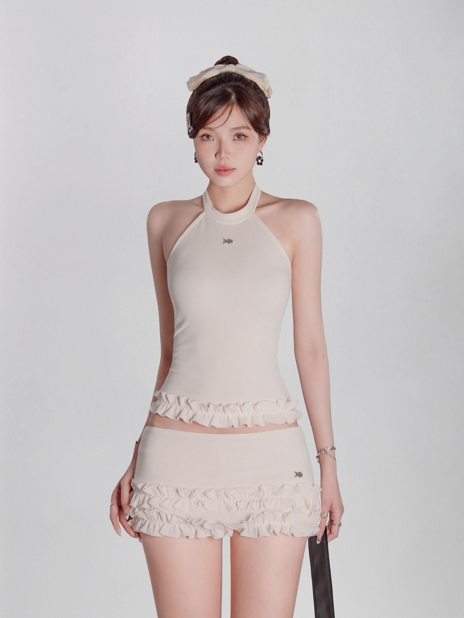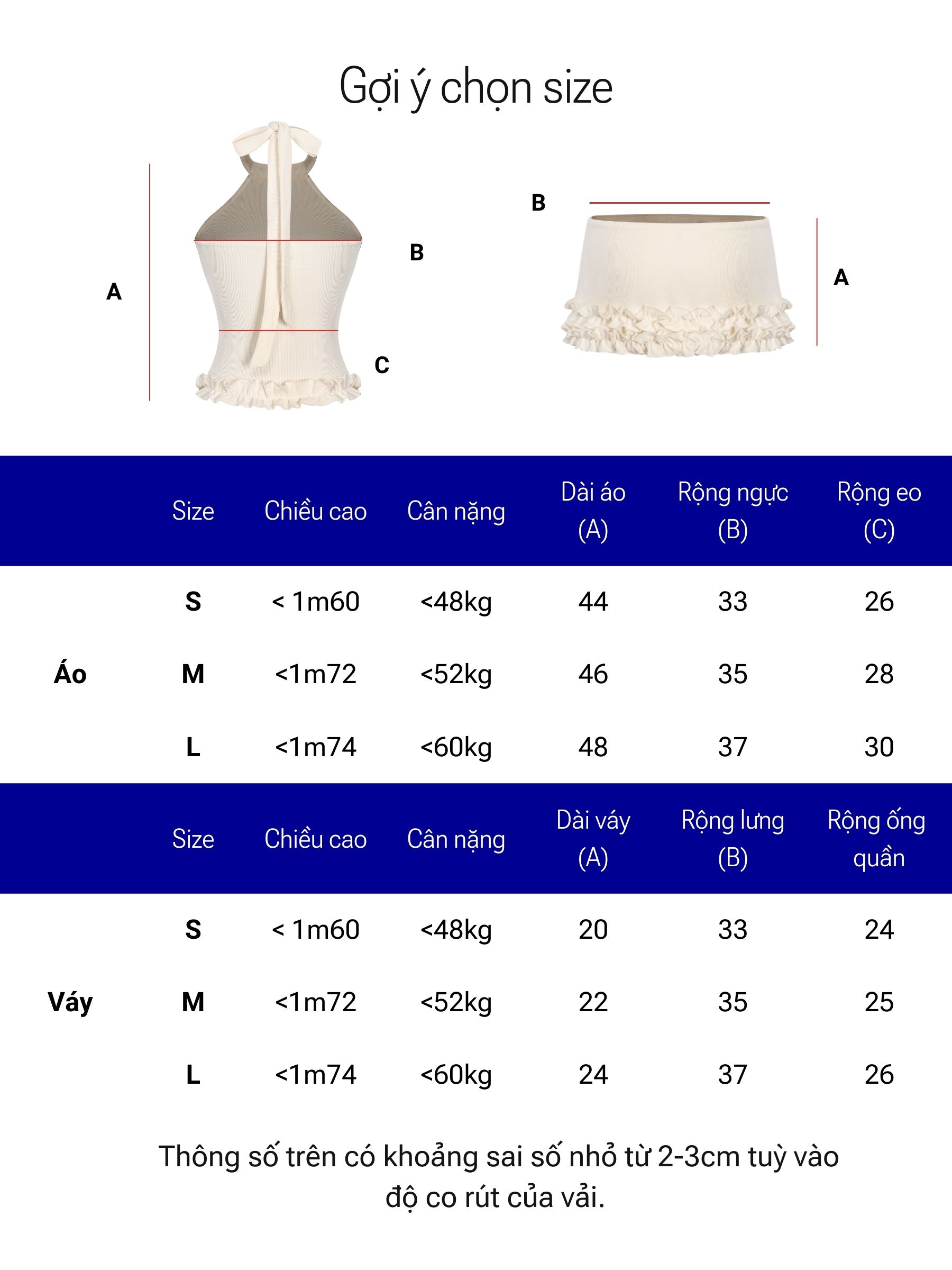 Set đồ bao gồm một chiếc áo yếm thắt dây nơ tinh tế tạo điểm nhấn nữ tính, trong khi họa tiết bèo nhún nhẹ nhàng mang lại cảm giác mềm mại và bồng bềnh. Chân váy ngắn ôm đi kèm tôn lên vóc dáng thon gọn, kết hợp hài hòa với áo, tạo nên tổng thể vừa trẻ trung, vừa thu hút.