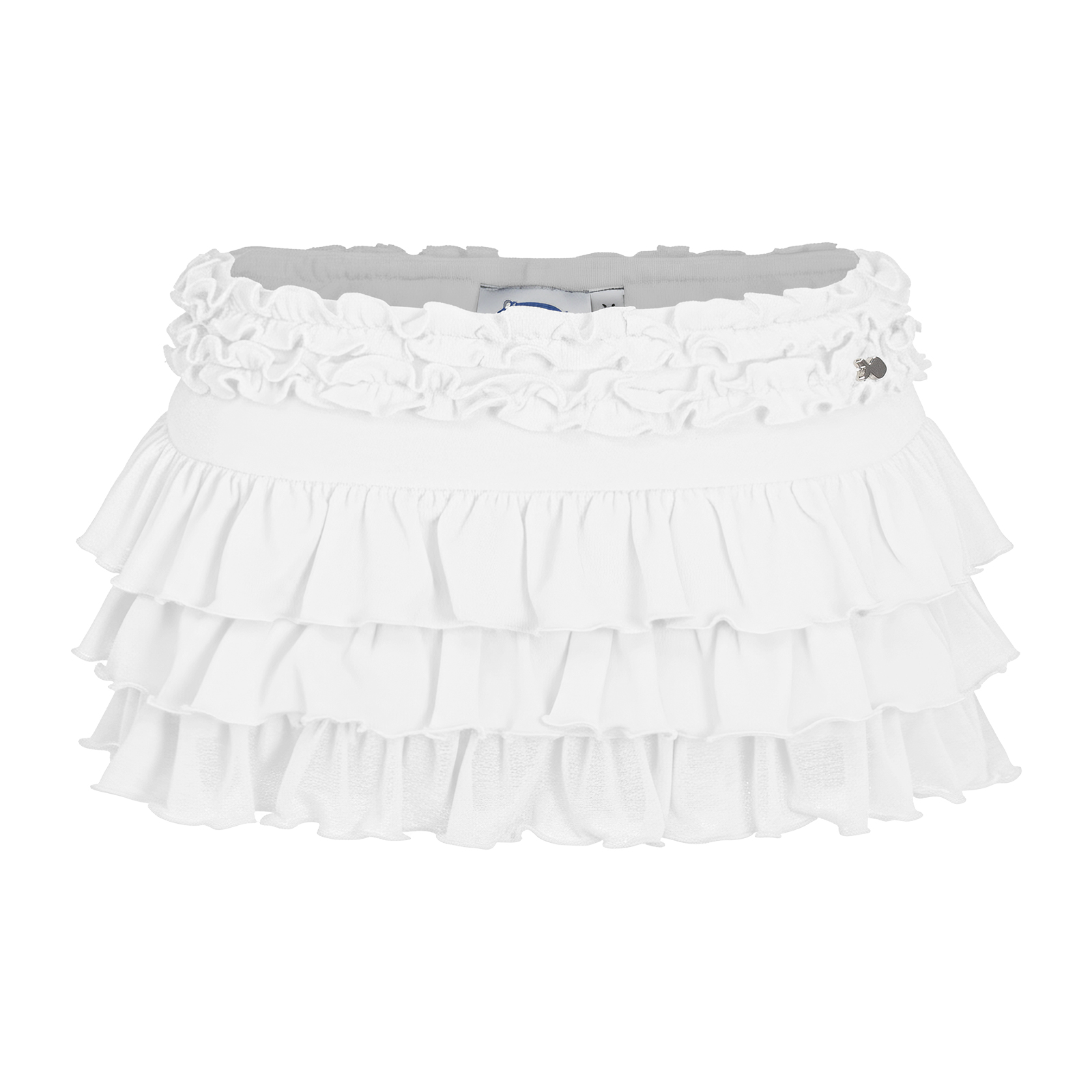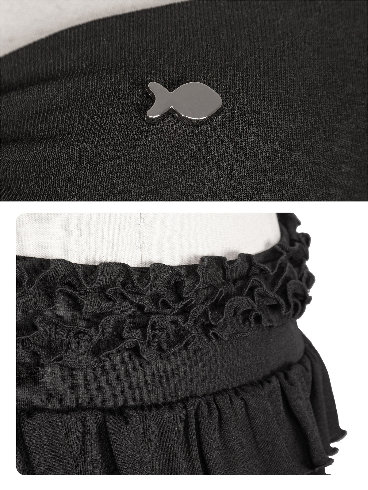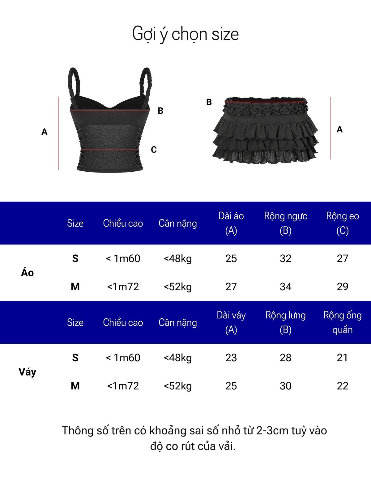 Bộ trang phục này bao gồm chiếc áo hai dây và chân váy đồng bộ. Chiếc áo được nhấn nhá bằng chi tiết phối bèo nhún mềm mại, tạo sự e ấp và nữ tính cho phần thân trên. Chiếc chân váy duyên dáng được thiết kế thắt dây nơ đáng yêu và đặc biệt tiện lợi khi có sẵn quần bảo hộ bên trong, giúp bé tự tin và thoải mái tuyệt đối trong mọi hoạt động.