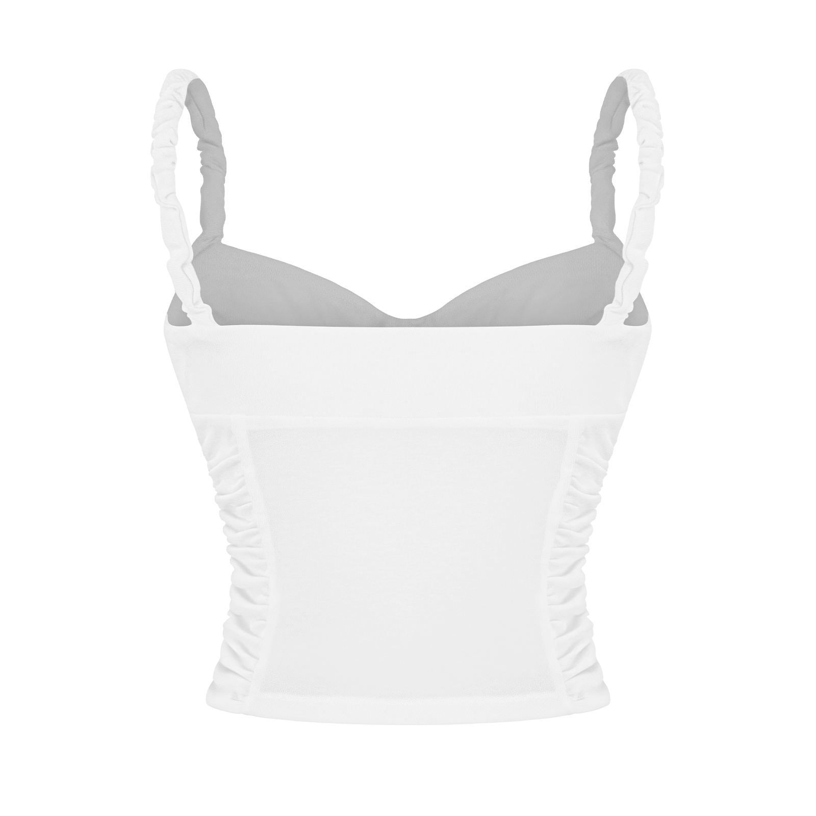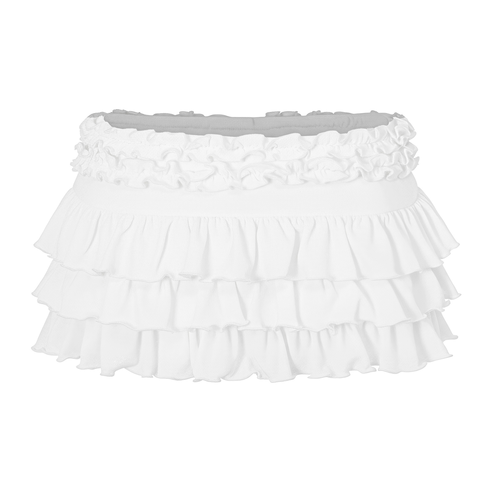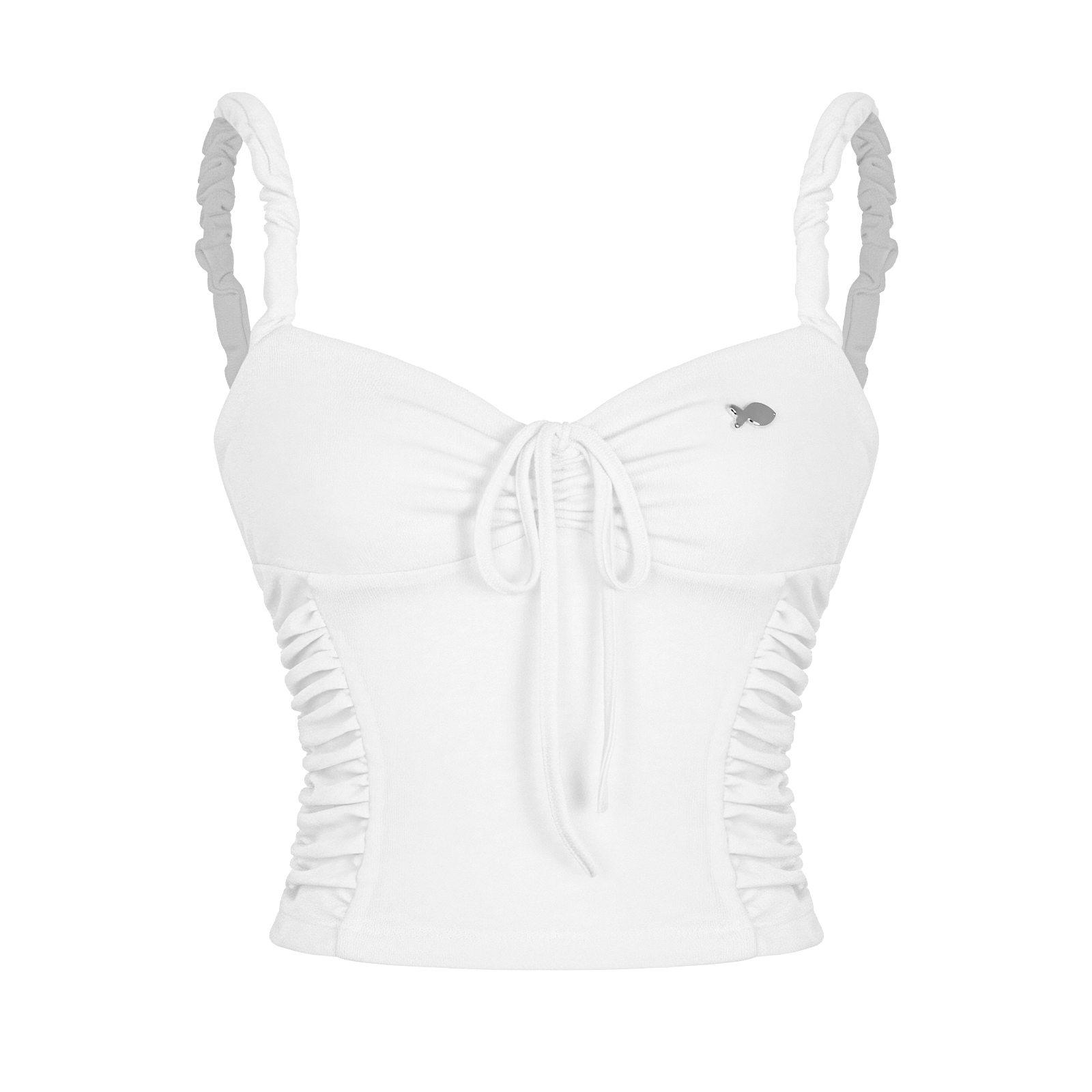 Bộ trang phục này bao gồm chiếc áo hai dây và chân váy đồng bộ. Chiếc áo được nhấn nhá bằng chi tiết phối bèo nhún mềm mại, tạo sự e ấp và nữ tính cho phần thân trên. Chiếc chân váy duyên dáng được thiết kế thắt dây nơ đáng yêu và đặc biệt tiện lợi khi có sẵn quần bảo hộ bên trong, giúp bé tự tin và thoải mái tuyệt đối trong mọi hoạt động.