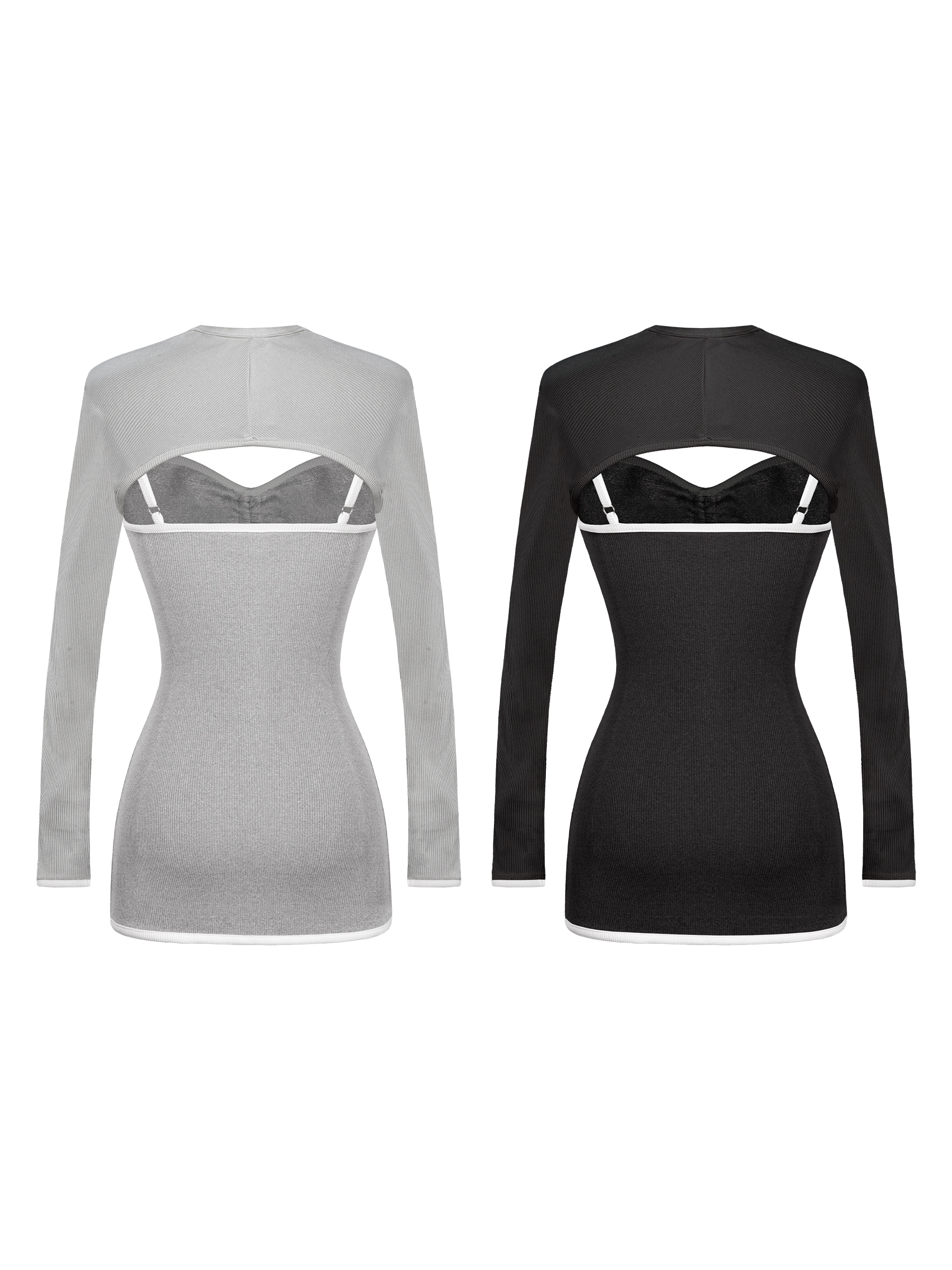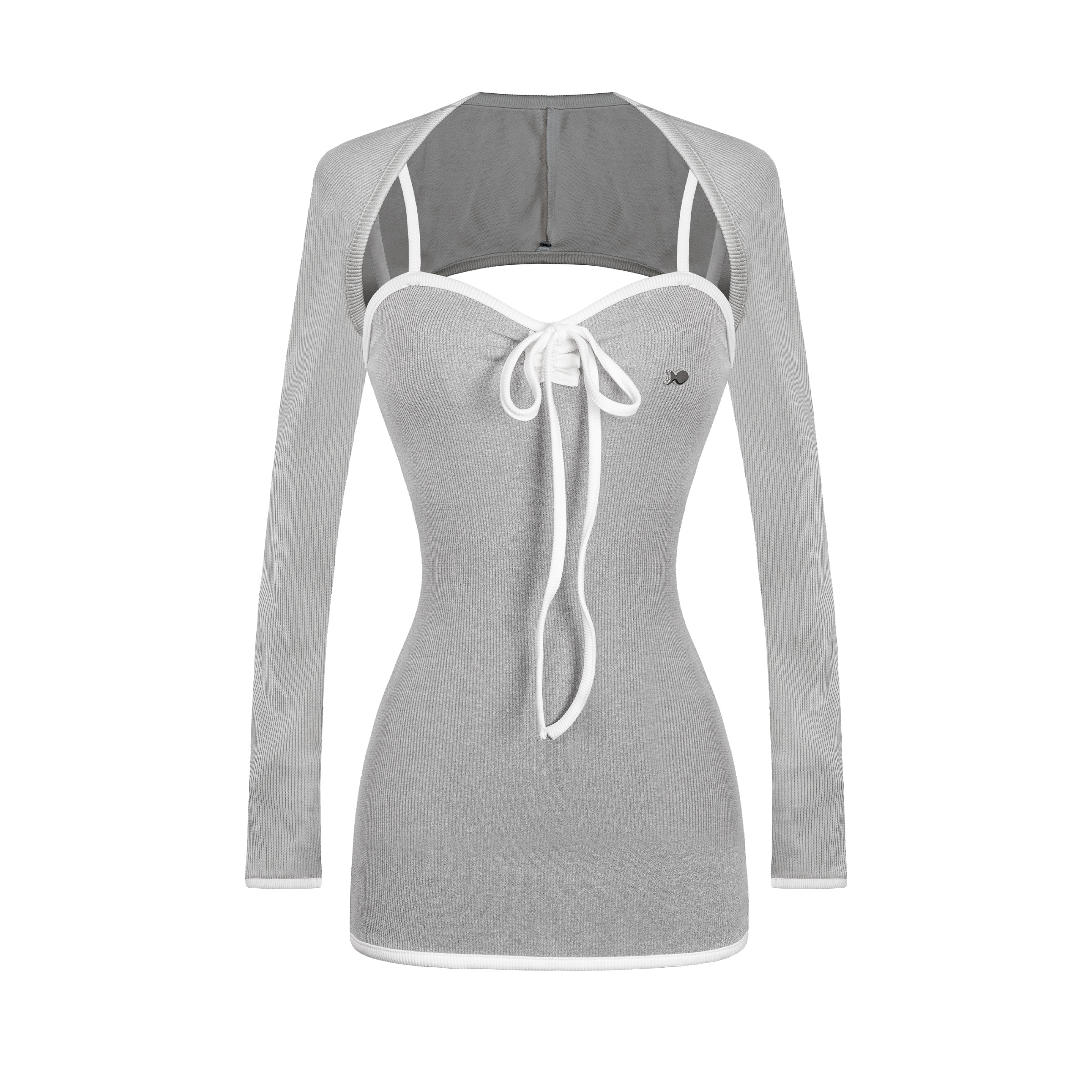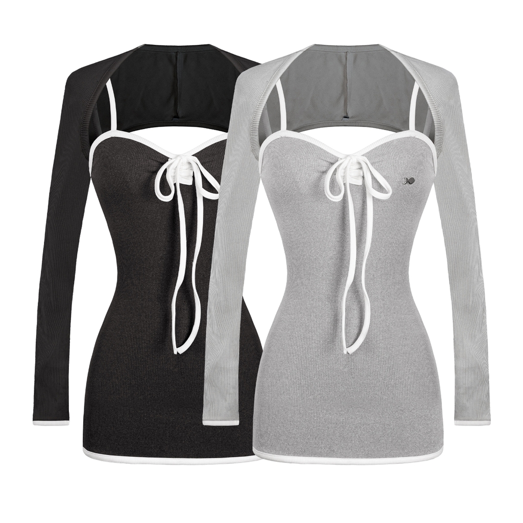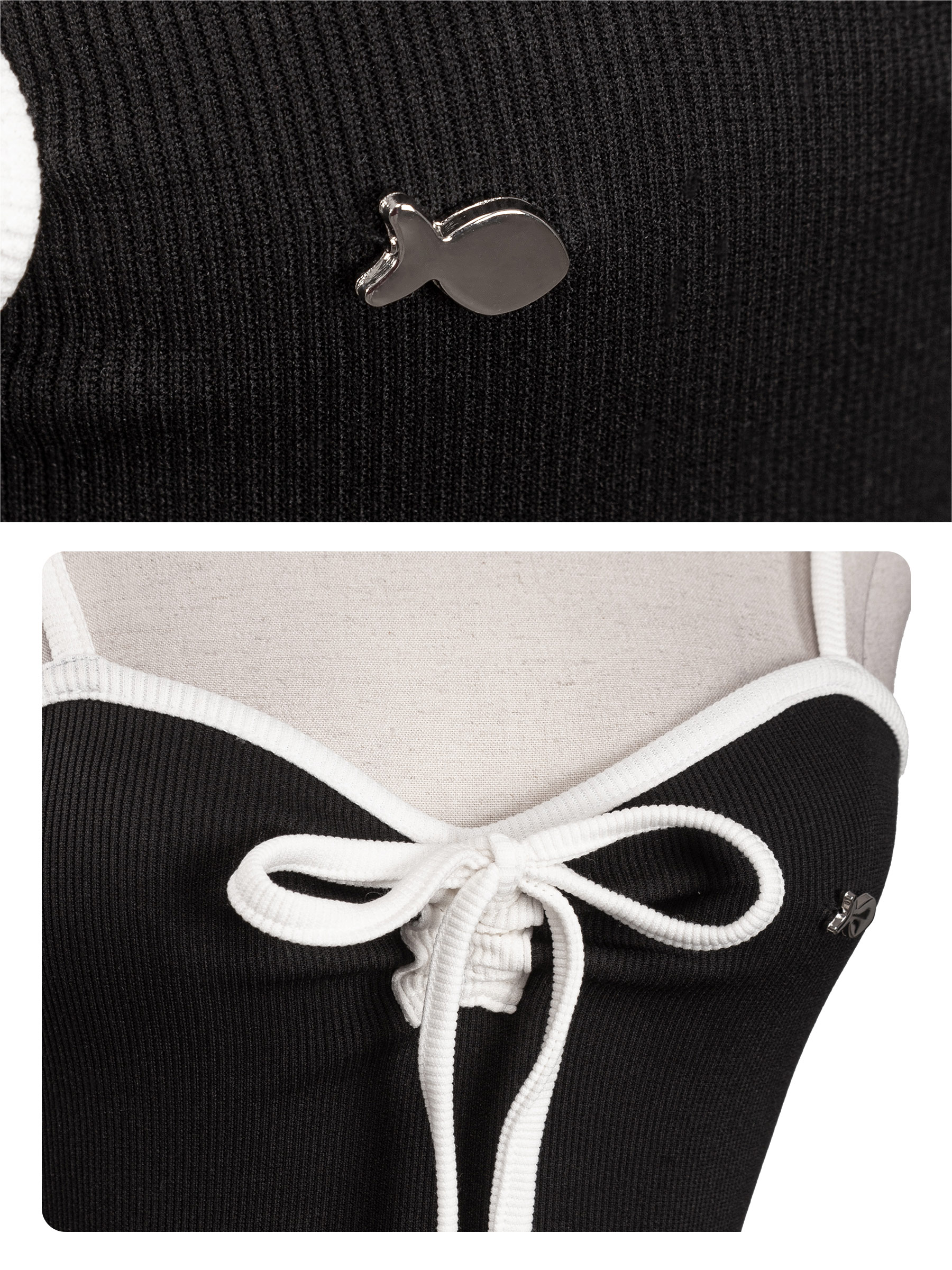 Set đồ bao gồm một chiếc váy hai dây ôm dáng, điểm nhấn là chi tiết thắt nơ tinh tế ở ngực, tạo nên vẻ ngoài ngọt ngào, đáng yêu. Khoác ngoài là một chiếc áo tay dài, có thiết kế viền tương phản nổi bật, mang lại sự độc đáo.