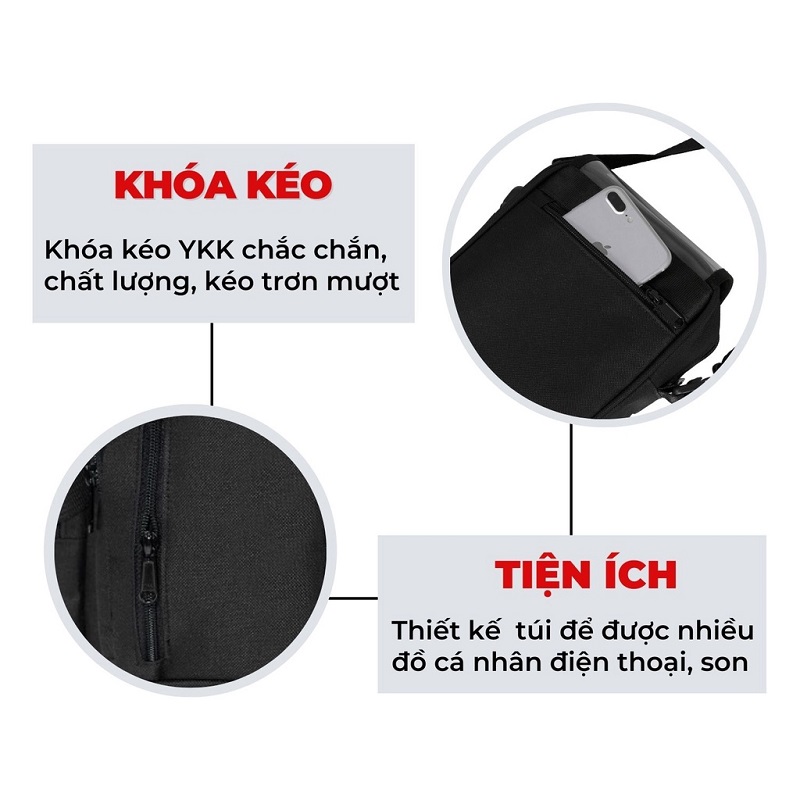 - Thiết kế: Túi đeo chéo nữ canvas có form dáng nhỏ gọn gồm 3 ngăn tiện ích có thể đựng các vật dụng như: Điện thoại, ví tiền, son, dây sạc,...kết hợp dây kéo YYK đen mượt.