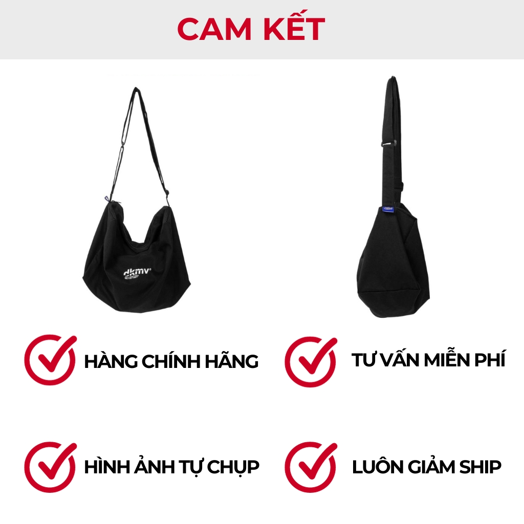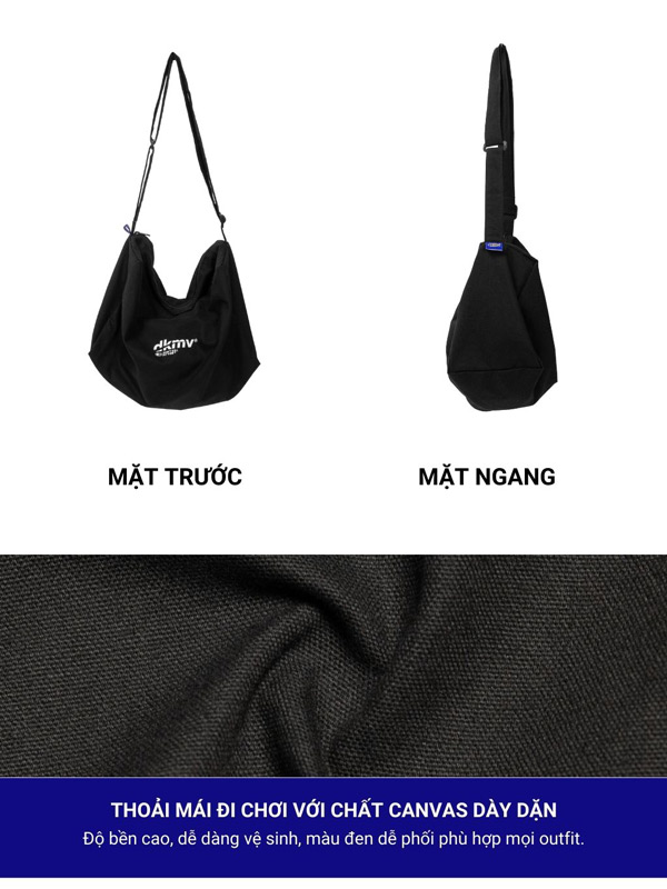 - Logo DKMV được in màu trắng nổi bật trên nền túi đeo chéo canvas đen trơn thể hiện được đặc trưng của thương hiệu. Bên cạnh đó, bạn có thể đính thêm phụ kiện cho túi đeo chéo canvas của mình để bộc lộ cá tính riêng nhé!