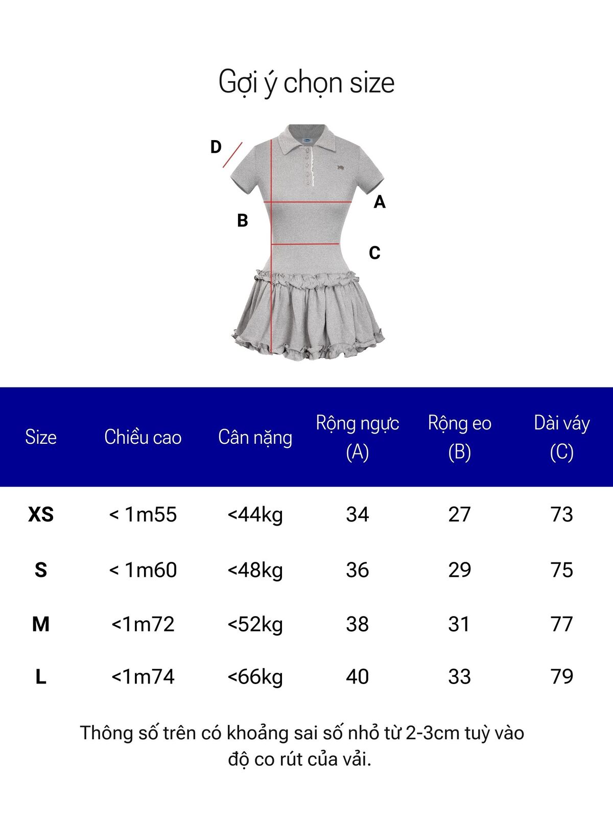 | Size | Rộng ngực | Rộng eo | Dài váy | Dài tay |